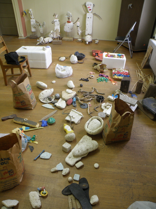 One reason I was on the driftwood pile was to look for empty booze bottles. I collected a variety of them in different sizes and made from both glass and plastic. They had to have their caps still on them and I preferred that their labels were soaked off by the river. A found quite a few today to go with the ones I have been collecting over the summer. I’m participating in a group exhibit where the artists address in some way the issues of mountain top removal and our need for coal. I have been filling up both bottles and discarded tires with the coal chunks and gravel that washed into here during the last flooding which also brought in all the driftwood that recently carbonized. Searching under the vines I did find pockets of coal gravel that were several inches deep in places. When I open up each empty bottle there is this heavy malted alcohol aroma that get neutralized by the coal. I’m still working on my coal piece and in the meantime…my exhibit at Bellarmine University with Scott Scarboro opened a couple of nights a go. I’ll post a few shots of the installation in my next post, but in closing here is one view of materials in my church studio room on Barrett Avenue. See you soon.