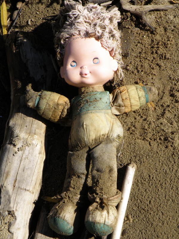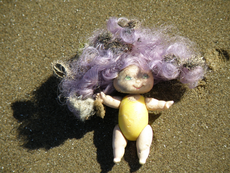 First, I came across this tiny doll with purple hair. If you look closely you can see burrs that are snagged in her hair-do. Later, I found this larger doll that was buried in the sand. I flipped her over and took her “portrait” and then walked away. It’s very possible that I will find her again in a different context.