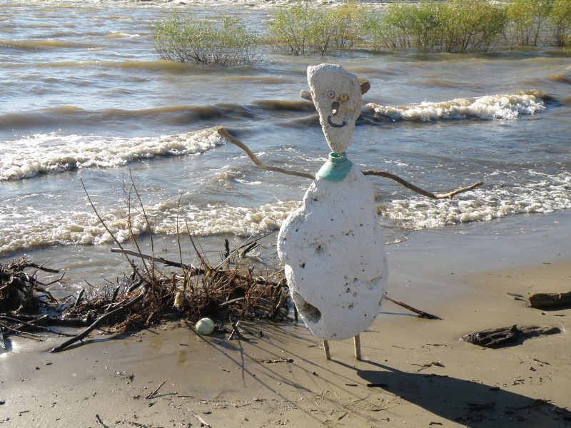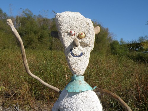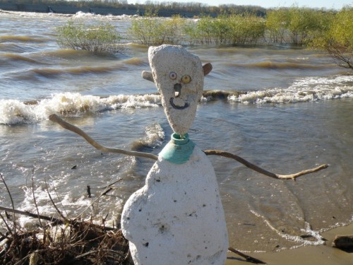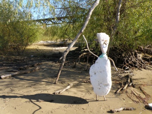 After scoping out the river’s edge…I move up the riverbank with the larger pieces of Styrofoam I have found and submit to my own urge to make something. Here is this day’s figure starting with the head in progress. You can gauge its size from my feet which are intruding in the bottom edge of the frame. As I walk along, I’m also looking for expressive sticks to use for arms and legs. The only tool I’m using here is my pocket knife.