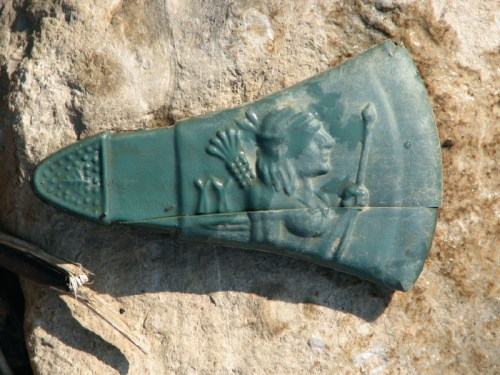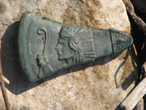 My most interesting find of the day was this plastic ax-head. I’m always on the look out for any real artifacts from the Indigenous people who lived here for thousands of years before Europeans arrived, but I have never found even the slightest fragment of pottery or the flakes left over from chipping projectile points. I think the river here is just too dynamic for those kind of discoveries. Nevertheless, this plastic ax-head says a lot about the time in which it was made. First, it is made of hollow plastic which is of course not nearly as durable as flint. Second, it clearly says where it was made which in this case is Hong Kong. Lastly, it promotes an inaccurate characterization of who are native people are. Here are the images that are on this souvenir tomahawk.