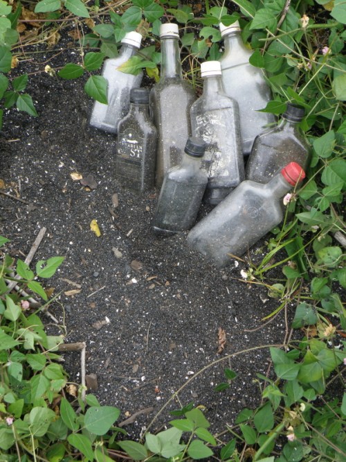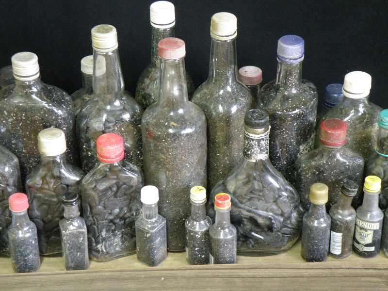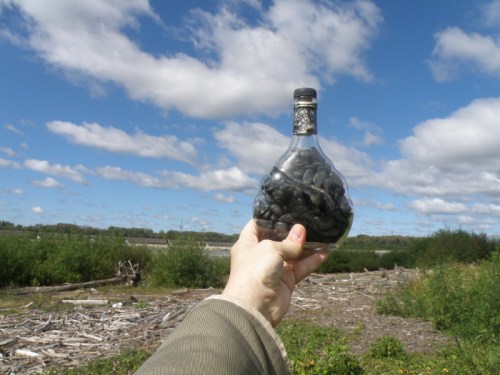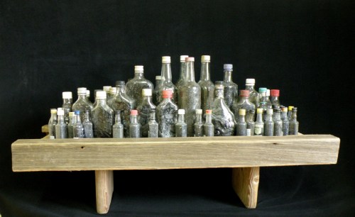 As promised, here are a few images from my completed bottle project. For the last several months I have been finding empty liquor bottles and filling them with the coal that washed into the park after last spring’s flood. A recent invitation to participate in a coal-themed art exhibition gave me a new reason to work with familiar materials.