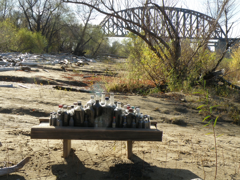 I prefer seeing my work out here by the river. All the other information in the pictures just adds to the moment. I did take a few images of my minibar against a black cloth at the church studio. Here’s what it looks like by itself and with a detail of the bottles. So far, it looks like this work will be exhibited in an exhibition in October 2012 and perhaps other opportunities will come up before then. And now, for the last two images. Thanks for checking in!