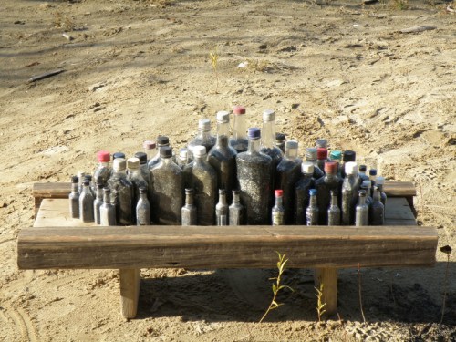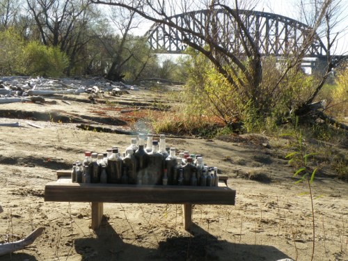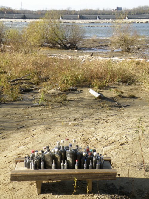 Since I started this piece here I also wanted a photo of it in the environment in which it was created one found and filled bottle at a time. Between trips to the Falls I would store the bottles in my basement until I got enough of them to make something with. When I finally decided I had more than enough I dragged it all back down to the river and set it up on a pretty autumn day. I also recalled the badly twisted ankle I had over the summer that took weeks to heal. I was doing this very activity when I rolled my ankle over in the sand. I think the finished piece has about sixty bottles on it. Most of them are made of glass, but the smallest ones are plastic. All the wood table/altar pieces were also originally found at the Falls of the Ohio. I used a small folding hand saw and cut the wood to length before bringing it home. Here’s a few views of the completed sculpture set up by the river.