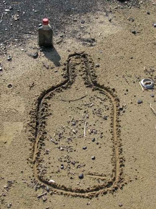 when i saw the drawing in the sand i thought you would put the bottles in there in the shape of a bottle but the table top looks better