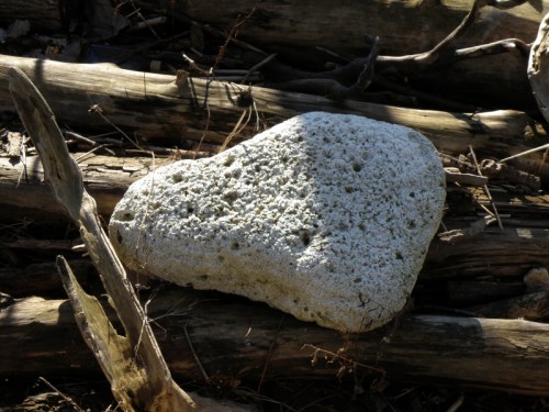 I have my collecting bag with me, but there’s not much to find today. It will probably be different after the river retreats. The trash left behind will mark how far the waves pushed the debris onto the land. I came across this nice-sized chunk of eroded polystyrene and decided to use it in today’s project. A short distance from this find was an even larger hunk of Styrofoam and I was in business for the day.