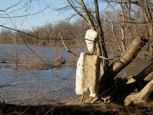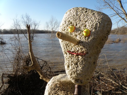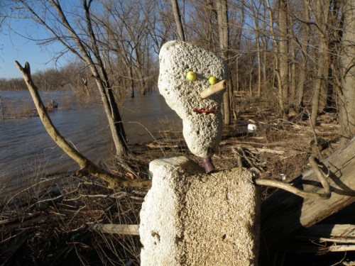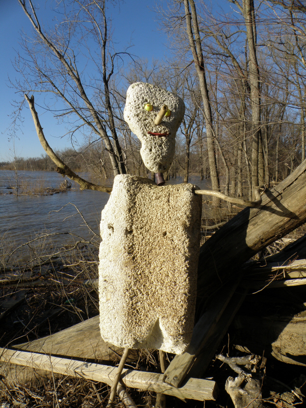 This second piece of foam was nearly as large as me. It took a bit of struggling to get it positioned where I wanted it near the rising river. In this section of the park much of the driftwood I was finding seemed dried out and brittle. I never did come across the right sticks, but had to make do with what today presented. I did like the happy-go-lucky expression on this figure’s face.