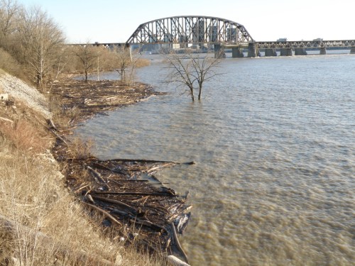 I think today’s post will be shorter than usual, but will need to type it out to be sure. On this visit to the Ohio River I found it rising which surprised me because we haven’t had much in the way of either rain or snow this year. When I arrived on the scene, many of the familiar places I visit to make my art were already underwater. I had to keep moving west in the park to access the shrinking riverbank.