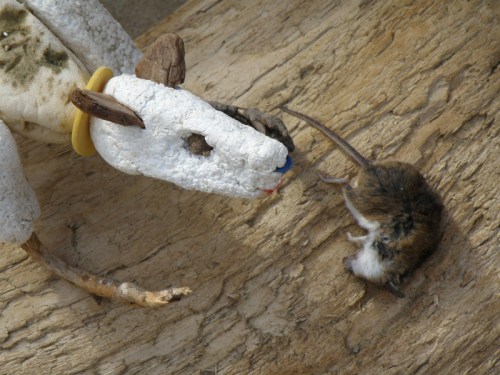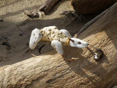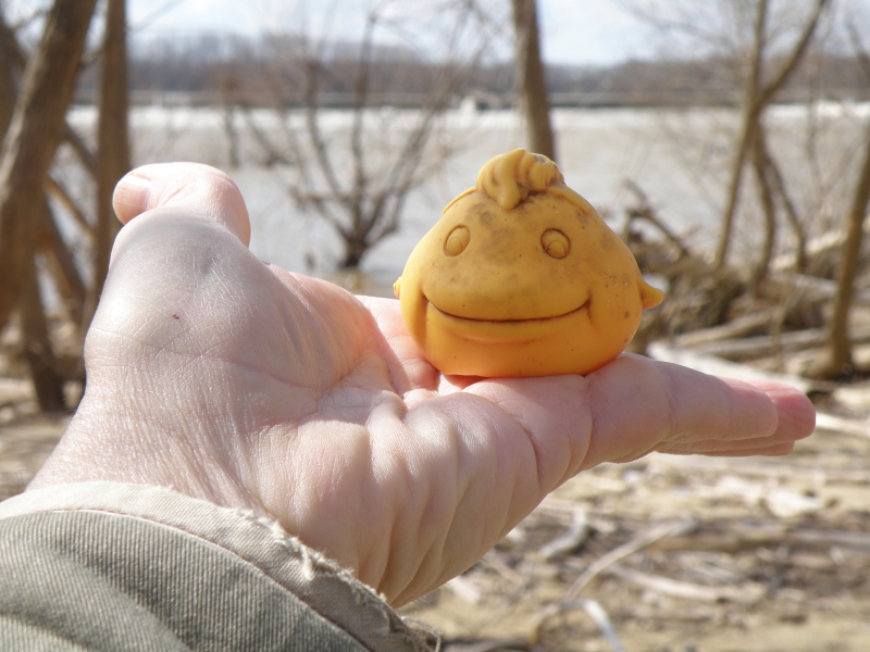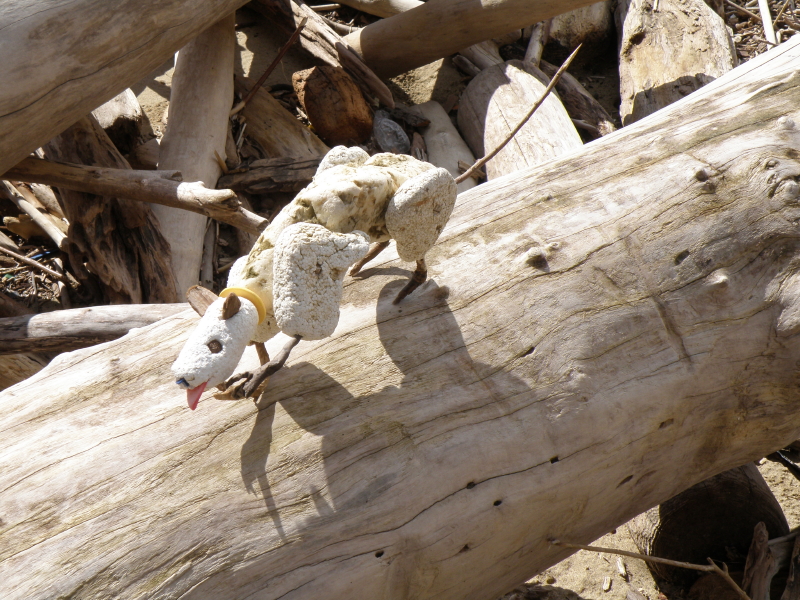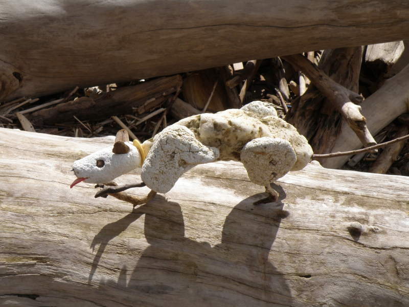 He called himself the “Guardian” and he was doing the same thing as me. Namely walking along the edge of the river and picking up objects that were washing ashore. The water level has been high and many of the youngest willow trees were poking out of the sand like large hairs on the back of some big animal you can’t totally see because it’s that huge. I tagged along with the Guardian and we conversed freely. It’s funny how no two beings react in the same way to the “treasures” the river offers up. For example, people are always trying to give me driftwood that they think I will like. Rarely, am I attracted to their finds. Driftwood aesthetics is a matter of personal taste as is the attraction for all the other stuff that washes up here. I didn’t think anything at all as the Guardian started collecting plastic bottles. While those bottles held little interest for me…the polystyrene chunks I was stuffing into my collecting bag held no interest to the Guardian whatsoever.