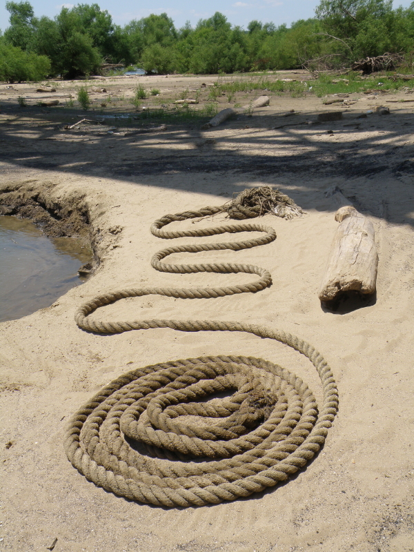 The terminal end of this rope is buried under the sand. I used that point to move and pivot the rope to create these other images. Here are two side views of the straight rope and the scene it underscores.