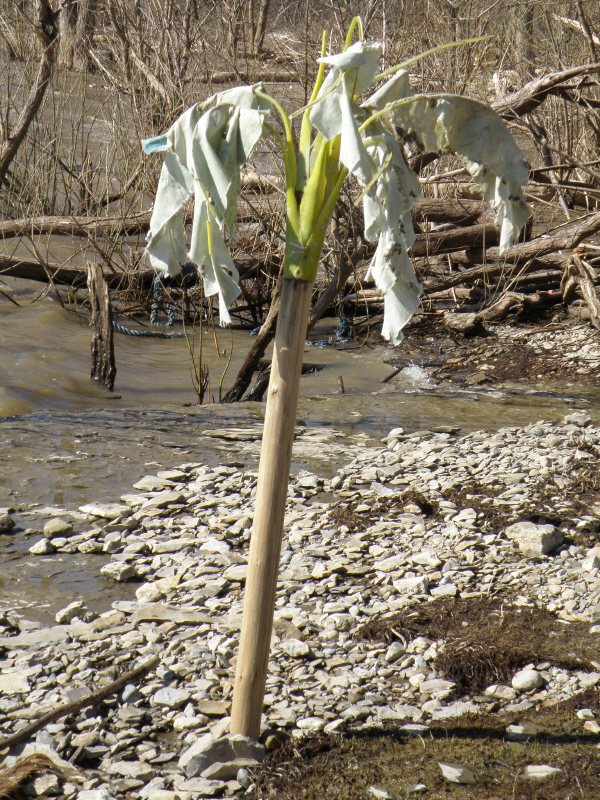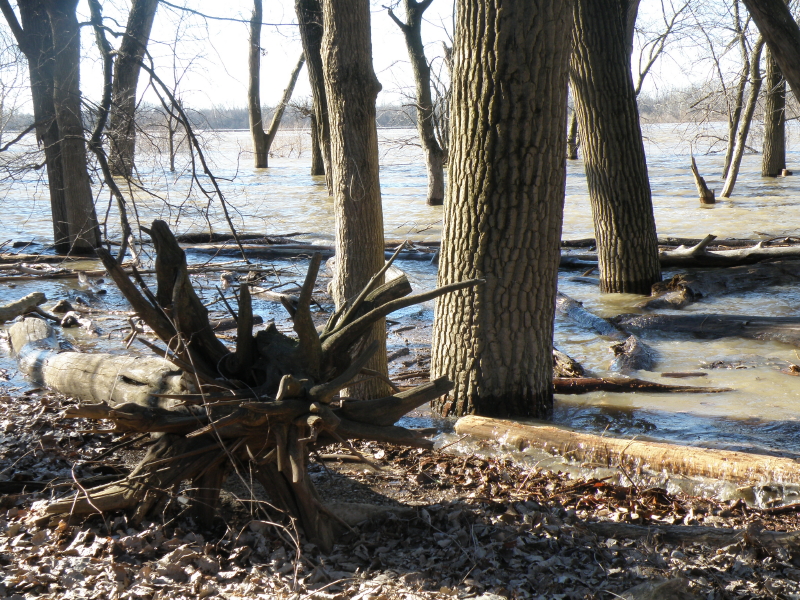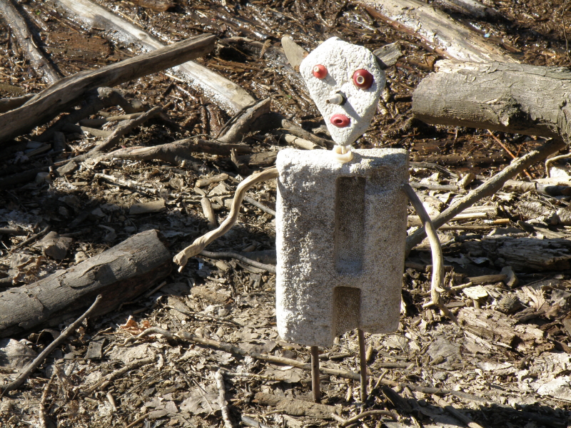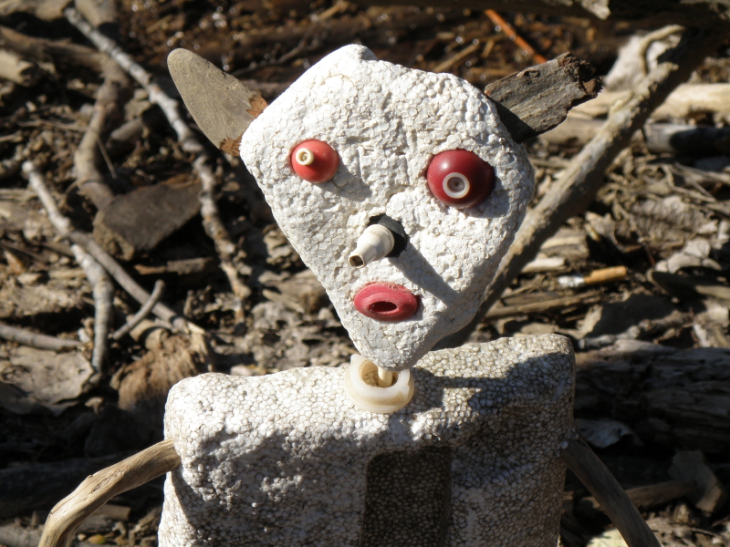 With my usual access points underwater, I explored the river’s edge just west of the Interpretive Center. Along the way, I found enough materials to create this Styro-Witness to help me experience and document the day. Although it was a very sunny day, it was still cool and windy. The river’s high level had me walking among the bottom land trees and walking over the logs that had been deposited here by previous floods. Every once in a while, I would walk into cold water hiding under last year’s leaves as the river creeps inland. The squeaky sound of wood rubbing over wood as logs rolled in the waves was occasionally interrupted by loud cracks as branches were separated from tree trunks.