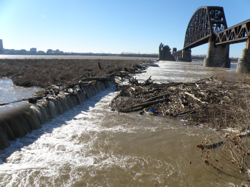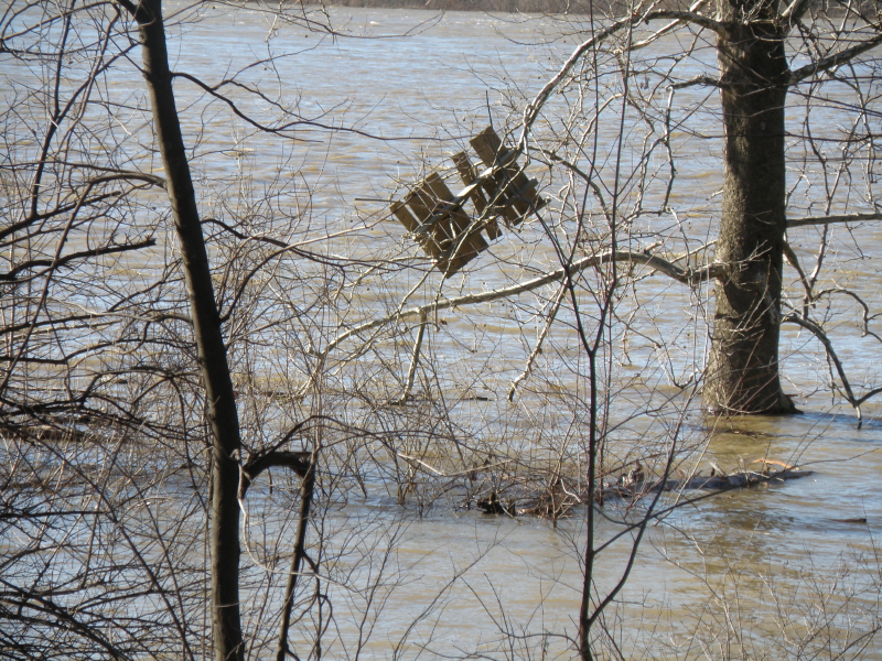 With my artworks in the back of my car…I stopped by the Falls of the Ohio State Park. The Ohio River has been up due to rain and snow in the northern part of the Ohio River Valley. Under the railroad bridge you can get a good sense for the strength of the current. New driftwood was accumulating and enlarging the wood already present. I could also see a lot of man-made junk intermixed among the natural debris.
