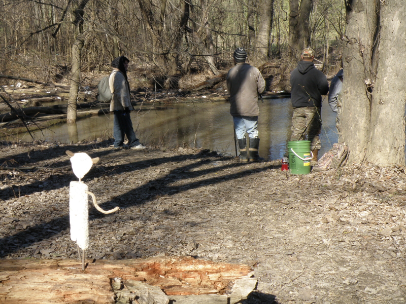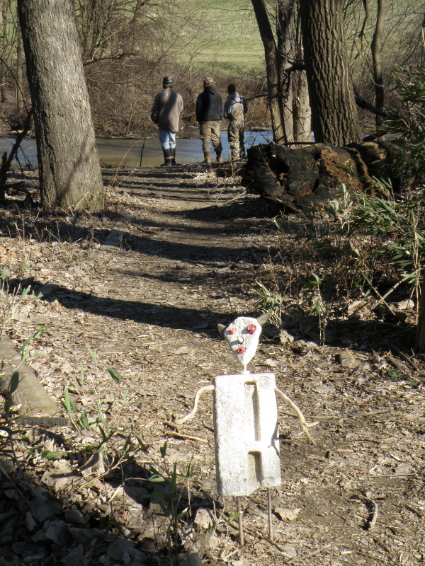 The Woodland Loop Trail eventually turns at a small creek that feeds into the river. Here I found about ten fishermen casting their lines into the high water. I decided to sit for a spell and watch while making small adjustments to my newest figure.