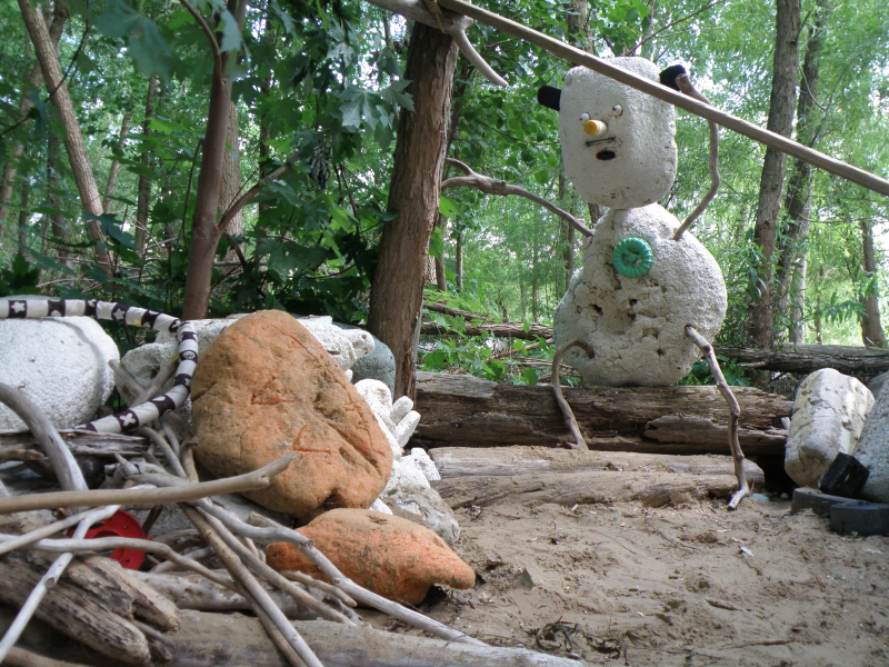 “So, how do you like it?” Spreading his spindly arms around my studio, I gathered that he was the architect of these recent improvements. I told my mustachioed friend that I just love it when people play along and contribute to my Falls of the Ohio project! I could see this clearly delighted him. He asked if there were any suggestions for improvements and I replied that I had a few ideas. To begin with, it is now much more difficult to move within the space. I whacked my head a few times on wooden supports. If the structure were higher…that wouldn’t be an issue and I also wouldn’t turn into a hunchback any sooner than I have to. I also added that I missed having the big log to use as an impromptu work surface. When I stood, it was just the right height. Now, it is covered up with stacked wood. I could see from his expression that this was probably enough in suggestions for this time. I didn’t tell him that I needed to create new seating because the plank I liked using had been damaged. That’s no big deal. With the clouds ahead promising more rain, I gathered my camera, collecting bag, and walking stick and bid my new friend so long…for now. Perhaps we’ll meet again? Looking back, I saw the big guy sitting in my customary spot. As I walked over the driftwood and sand, I wondered if my next visit to this site would harbor any more surprises?