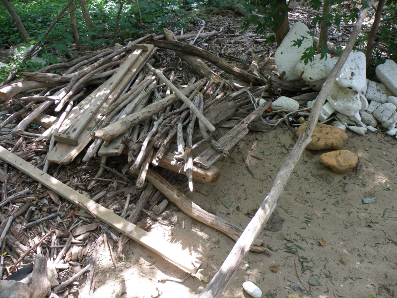 I never told you how this story played out and so now is as good a time as any. A few weeks back, I had posted on how some unknown visitor(s?) had been altering my outdoor studio at the Falls of the Ohio State Park. For a least two years previously, I had been storing my river found art materials at this site. People who stumbled upon this spot often mark their presence by changing how I left it in some way. Folks might rifle through the junk or take or destroy the Styrofoam figures I might leave behind. I don’t mind this…in fact, I encourage the interaction. On site, it’s easy to make the connection that all these poor materials I use came from the river. I still think of my outdoor studio as a shared laboratory for this exercise in creativity. It’s an acknowledgement that all this junk is out there and that something else positive might come from it. For several weekends, my latest visitor has been building a wooden driftwood structure over my spot to the point where it usurps my ability to continue working there. So, I made a few changes that I thought would benefit both of us. I modified the structure so that I could stand within my site. I also opened up the space more which I thought also encouraged additions. I was curious to see how my visitor would react and here are the pictures.