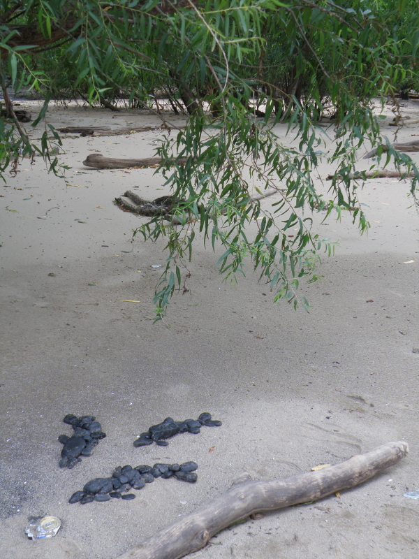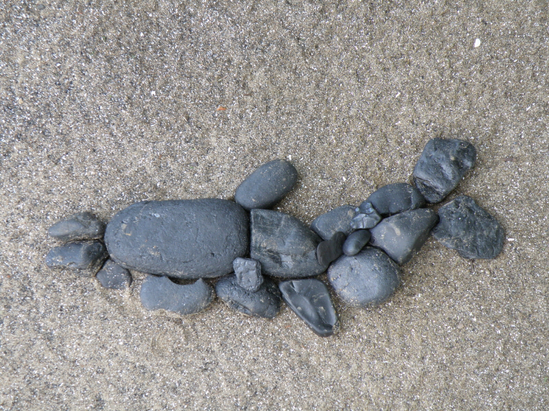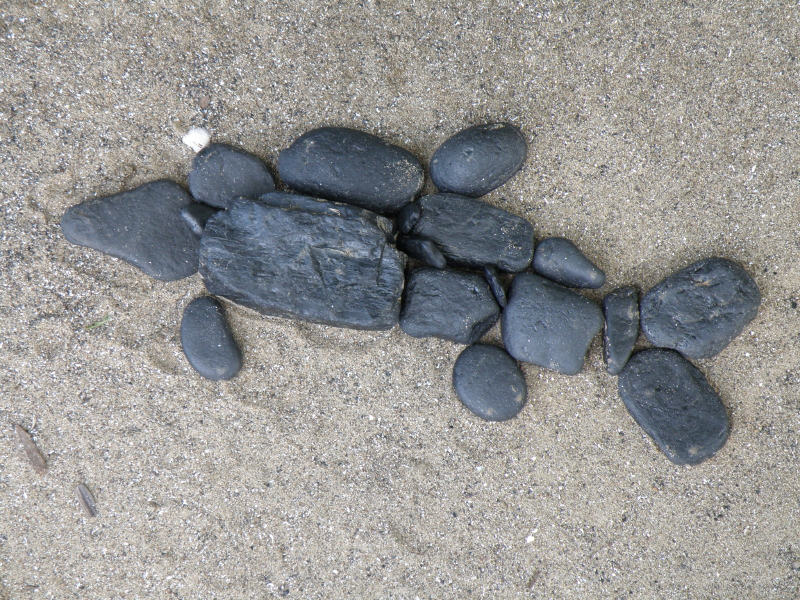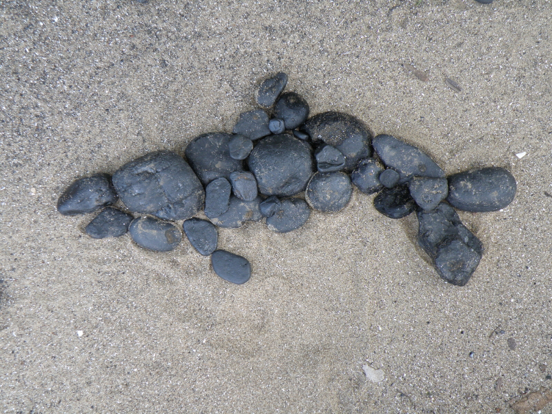 I used river smoothed coal I gathered on site and improvised these three fish on the sand. Peppering the silica granules black is coal dust. The white dots are pulverized mussel shells.