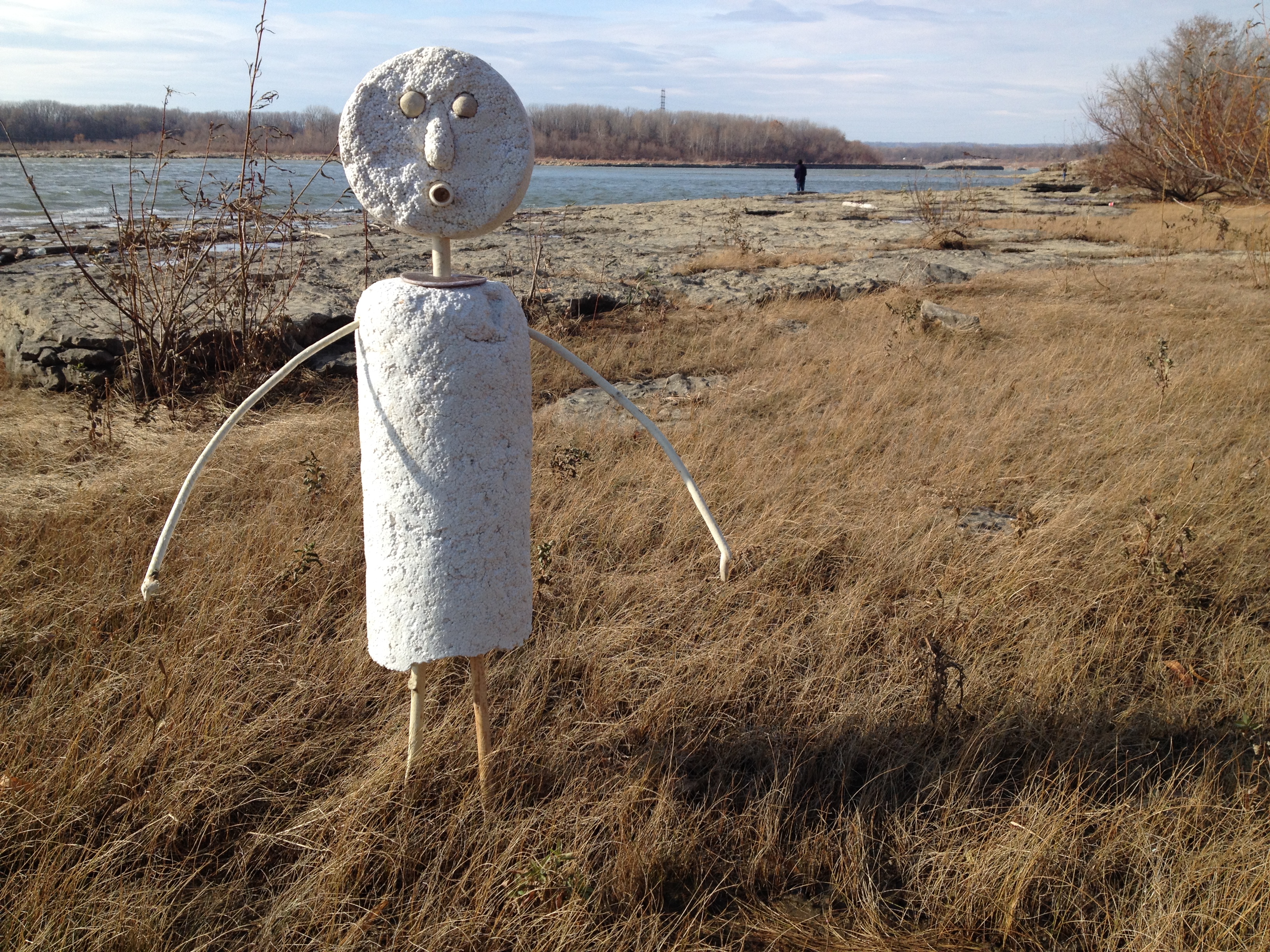 Having touched base with the Interpretive Center, I decided to connect with my own peculiar low-tech universe. On this day it was sunny and windy and I made my way under the willow trees which provided some shelter from the breezes. My larder of river-polished polystyrene chunks as white as the recent snowfall was there waiting for me. I got an idea to make a particular figure from other items I found that day, but the piece I started crumbled to pieces. A rare but not unheard of temporary setback. I will return to it when I find the right form for this figure’s body. On to improvised plan #2. I looked around my pile and selected two new pieces and joined them together as head and body. The addition of beaver-chewed willow stick limbs and some stones for eyes and plastic for the mouth and you have the basics of a figure.