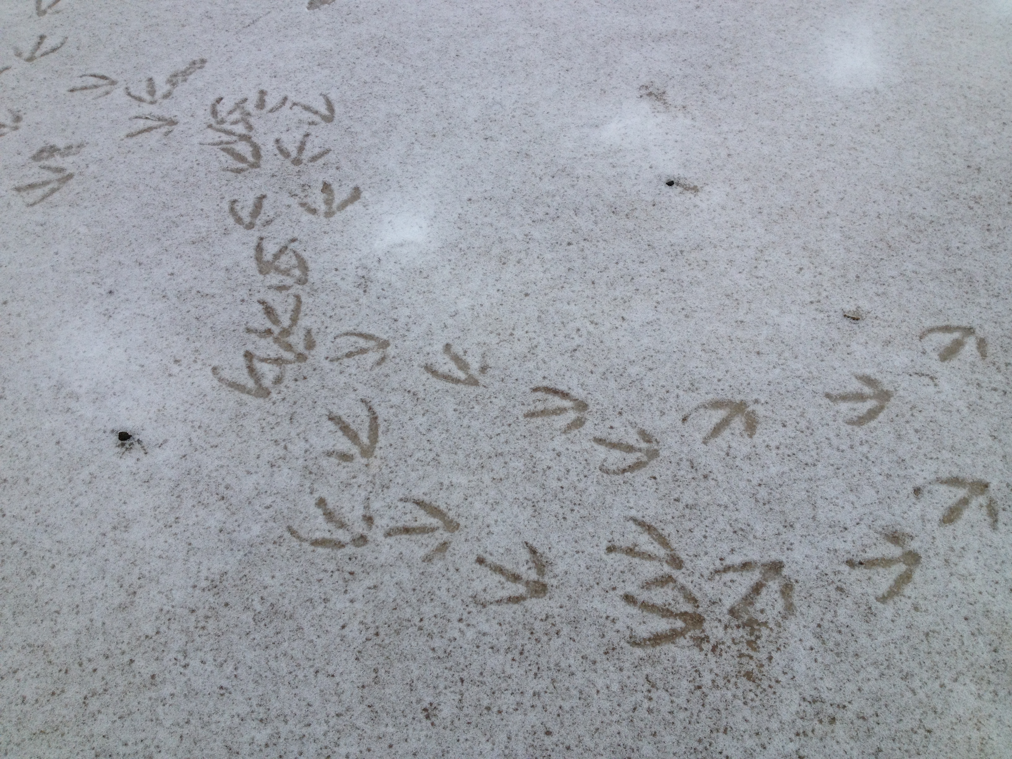 I find there is a surprising amount of life out here. Although I’m the only person around, I have already spotted several species of birds that don’t seem to mind these conditions. Geese have left there meandering tracks in the snow. In the air, I watched both a Peregrine falcon and a nice flock of Ring-billed gulls engage in aerobatics over the river. I come across other tracks in the cold mud that has me momentarily frozen in place. I sort of recognize them, but there is also something not quite right here that I can’t put my finger on?