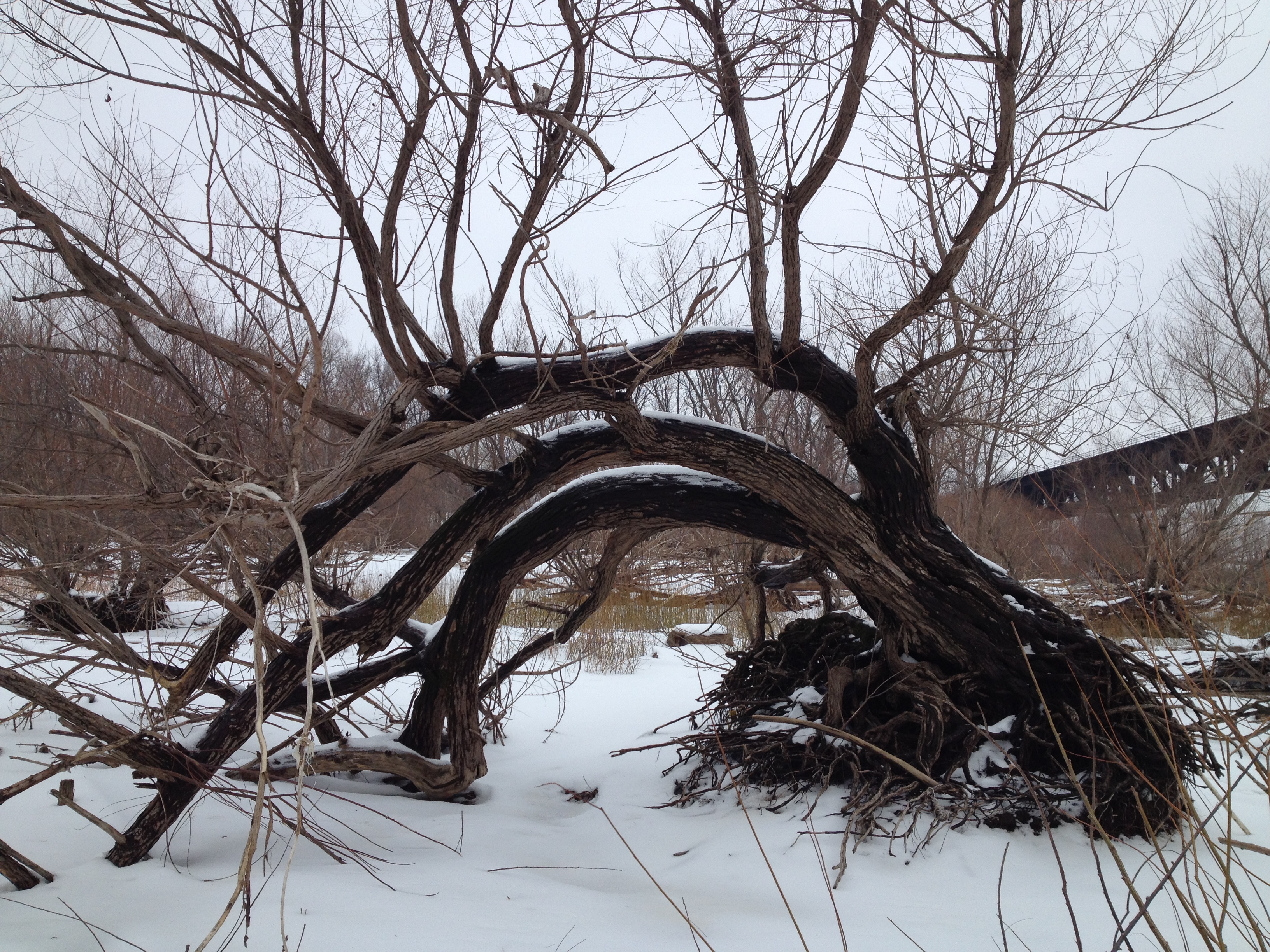 I noticed the beaver sampling willow it had already chewed upon as it moved down along the river’s edge. I stood transfixed by this nearly mythical animal. I finally lost sight of the beaver when it went behind an ice formation and unseen by me…slipped back into the water and disappeared. I searched around for a couple of hours hoping to have another glimpse of this Polar Beaver or any others that might have been around, but ultimately was unsuccessful. I returned during the next two days, but this beaver apparently moved on for good. I was lucky to have seen it, but can you blame me for being greedy and wanting more time with this magical animal? Wouldn’t you wish for the same if you were me? When my reverie lifted, I realized that I could no longer feel my toes and my digital camera was also feeling the cold and not operating properly. It was time to go home and I will leave you with one final image from this trip. Here is a view of a favorite old willow tree as it appears during the heart of winter. Spring will soon be around the corner and I will see you again at the Falls of the Ohio.