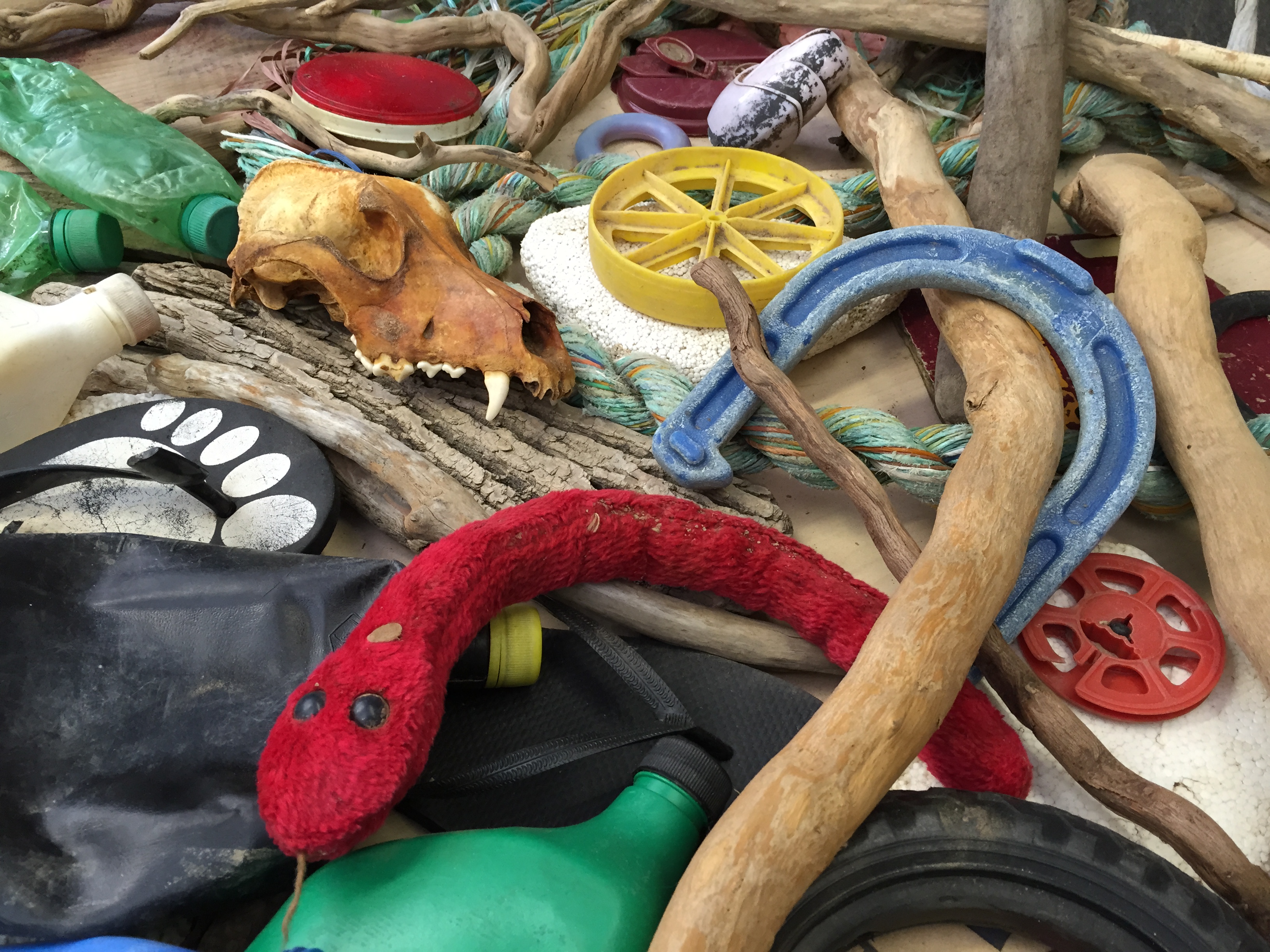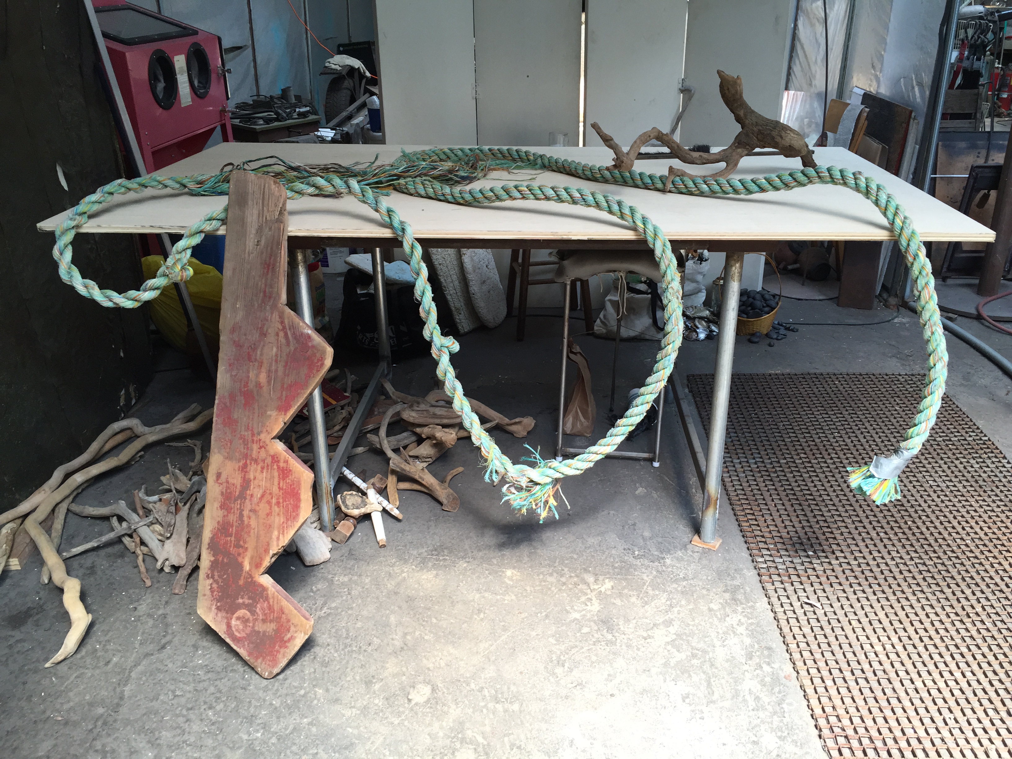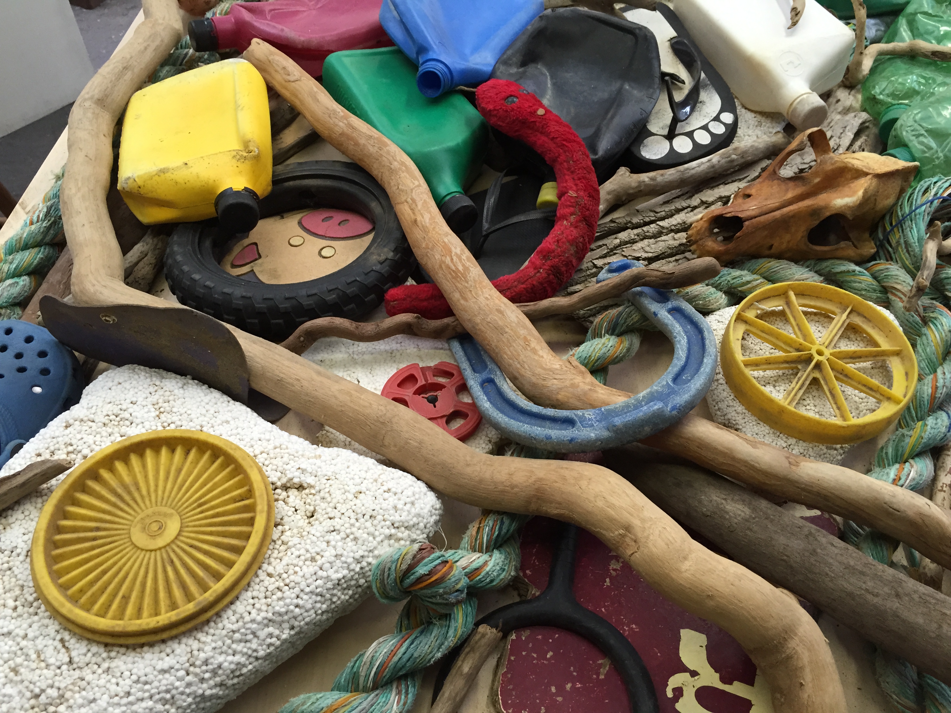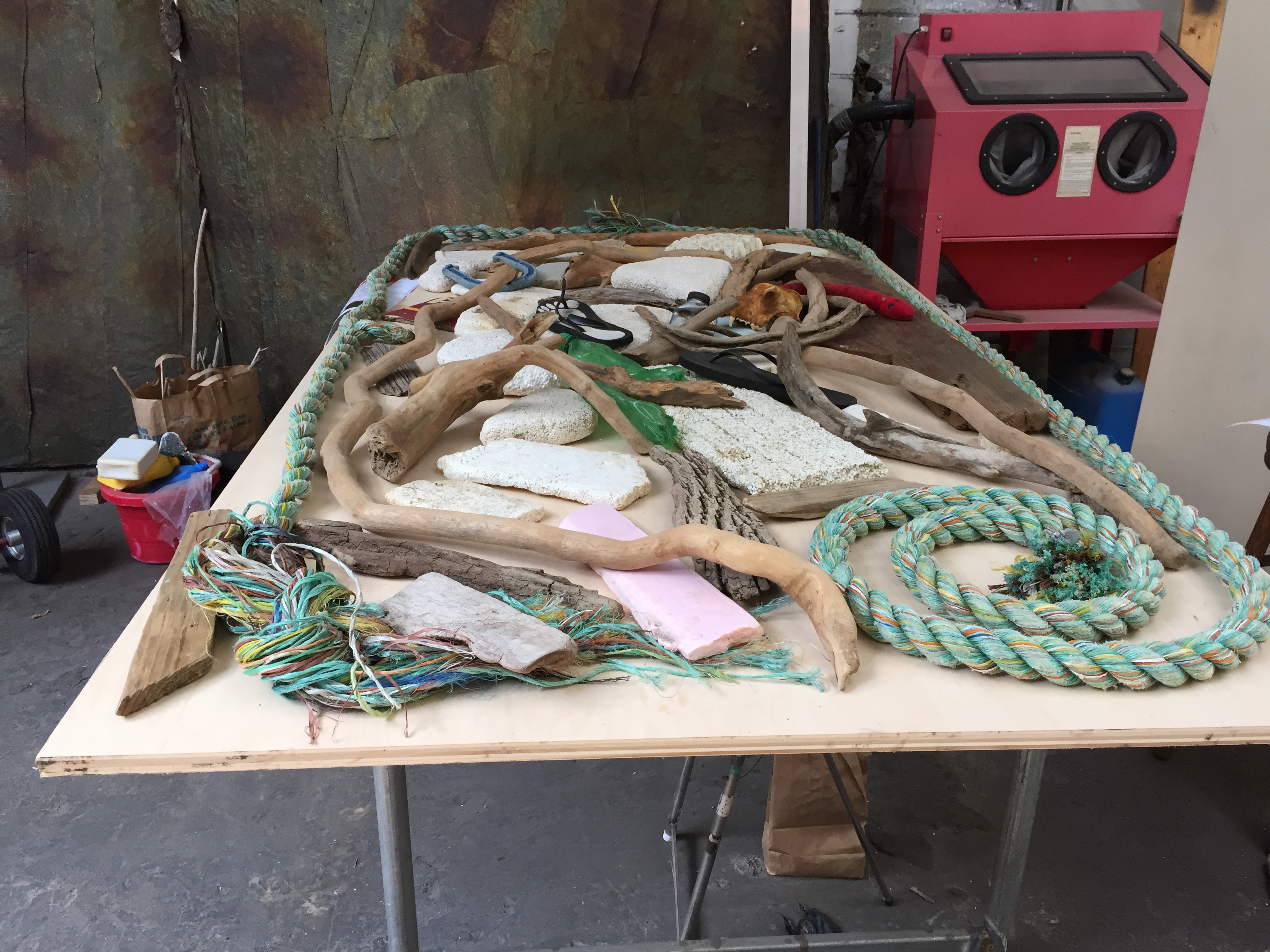 As you can tell, this can go in a lot of different directions because of the wealth of materials available. All the stuff going onto this panel will have been collected within the Falls of the Ohio State Park. There is no need to go anywhere else! I want it to be as authentic as possible in so far as representing the kinds of stuff you can find floating in the Ohio River. Since these images were made, Solidlight (the Louisville-based company creating the new Interpretive Center displays) has suggested some changes. They want to see more driftwood used as a unifying element which should be easy enough to do. I hope, however, that they will appreciate that people will be just as interested in the variety of crap I’ve collected as well and not settle for a cross-section of materials that can be found at the water’s edge. To see that, a visitor simply needs to go down to the river to experience that already in place. My good friend, sculptor Tom Butsch is letting me use his studio to construct this. My own space at home is simply not large enough to accommodate this. A couple more pictures before ending.