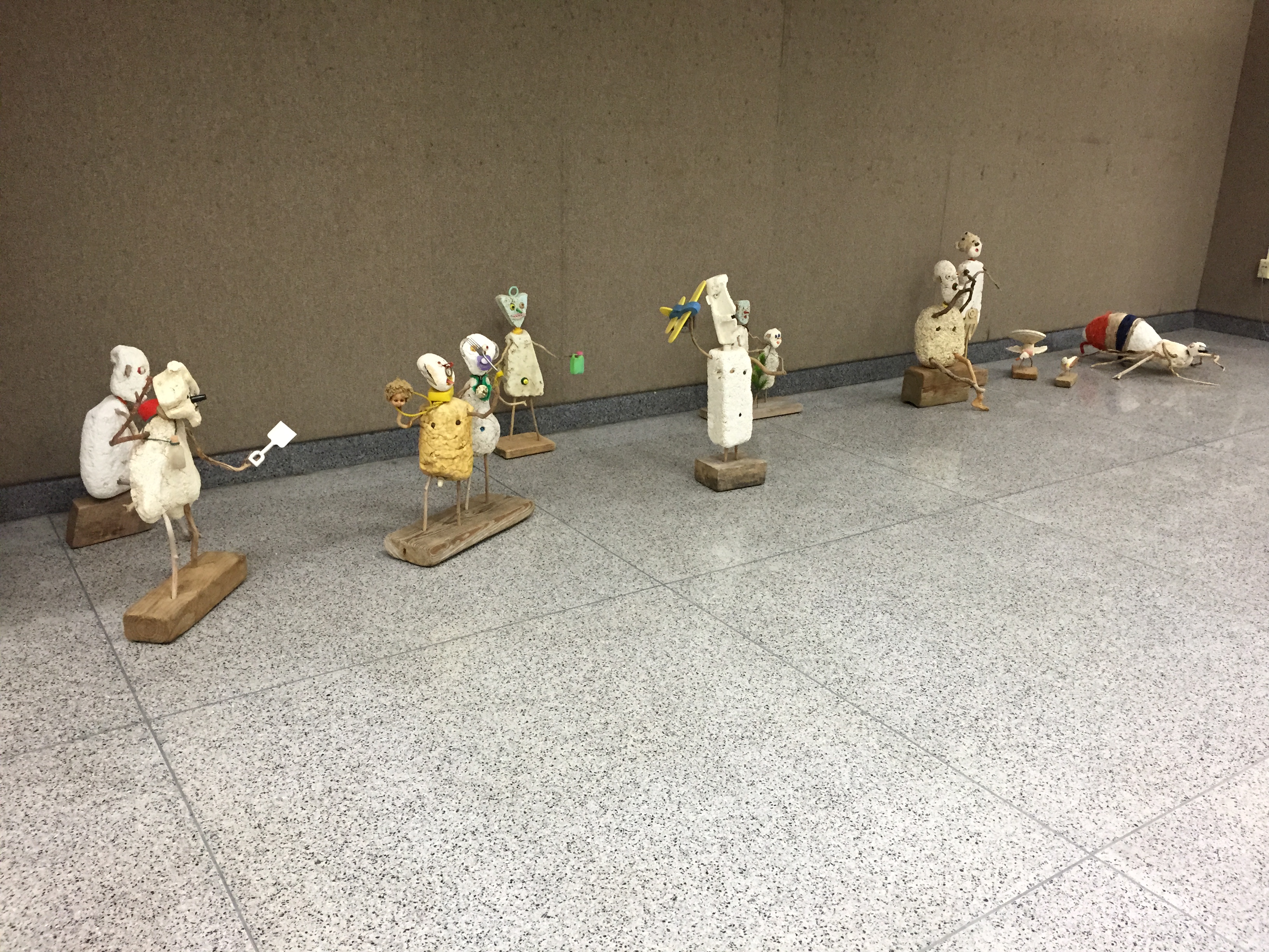 Here are a few more artworks I have “staged” prior to loading them in a cargo van. I have many figurative Styrofoam sculptures that I have never shown in exhibition contexts. In the above image, you can see my latest piece which continues the work I have been doing with found plastic containers. I built a wall-mounted shelf from river-gifted wood and arranged the colorful plastic containers that I have also scavenged off the riverbank. The individual bottles have Velcro on their bottoms to help secure them onto their narrow shelf. A length of twine is there to help keep the bottles together while in transport.