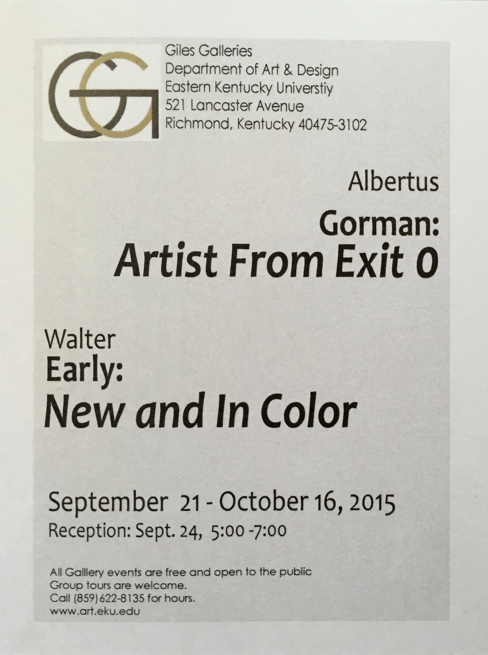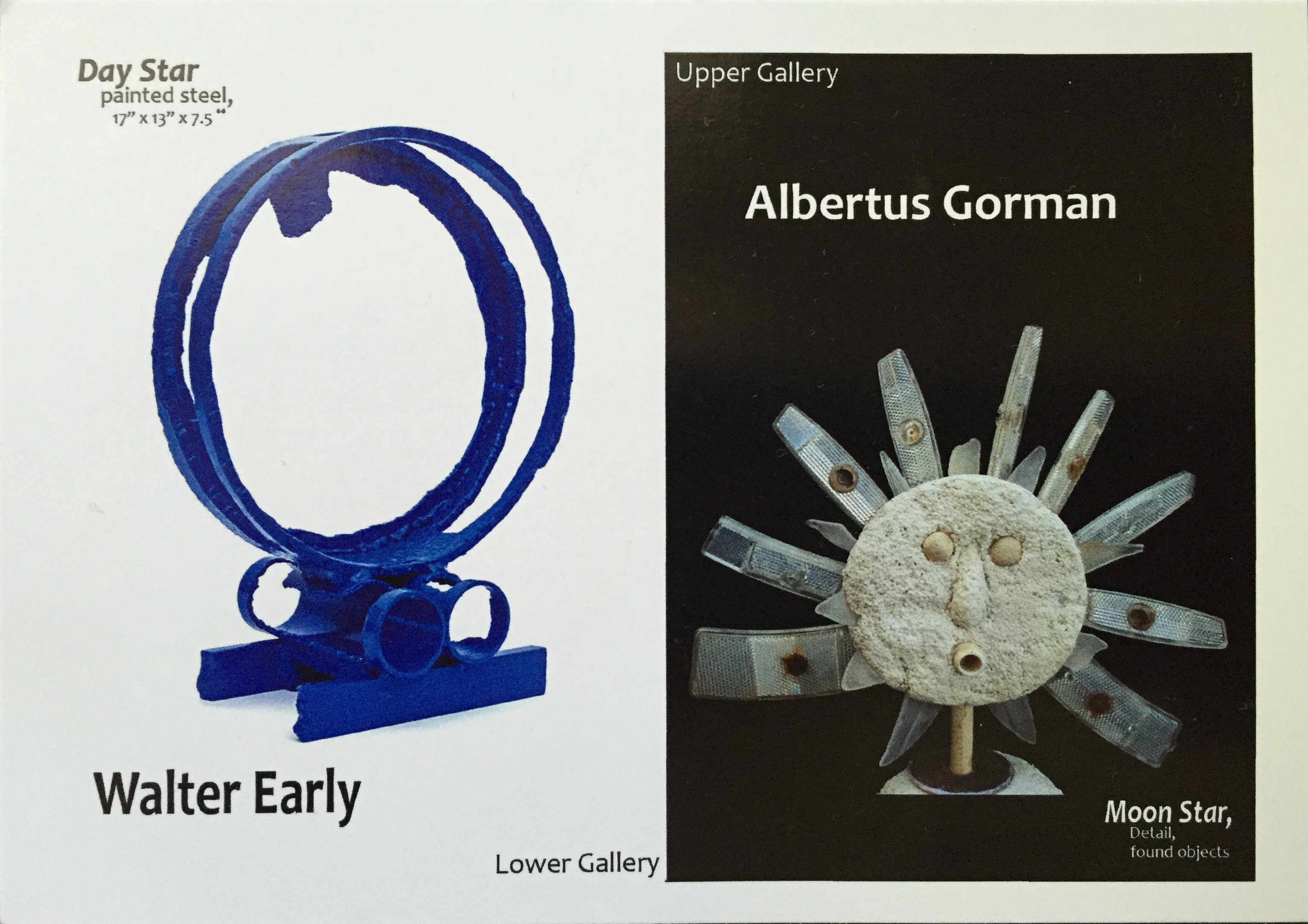 Although this is my first post of the month…my heart has not been far from the river or the odd kind of art that I make from the found remains of our material culture. A few months back, I accepted the generous offer from Esther Randall, who is the Gallery Director of the Giles Galleries at Eastern Kentucky University in Richmond to show in their upstairs gallery. The bottom gallery will hold the colorful welded sculptures of Walter Early and his show will run concurrently with mine. I do like the postcard Esther created. She found two works by two very different artists that share the word “star” in their titles. Our exhibitions will open during the upcoming week and if you happen to be in the area. Please do stop by and check out our art shows. Richmond is about 22 miles past Lexington, KY or about an hour and 45 minute drive from Louisville. Here is the reverse of the card that gives other particulars about the opening reception and run of the show.