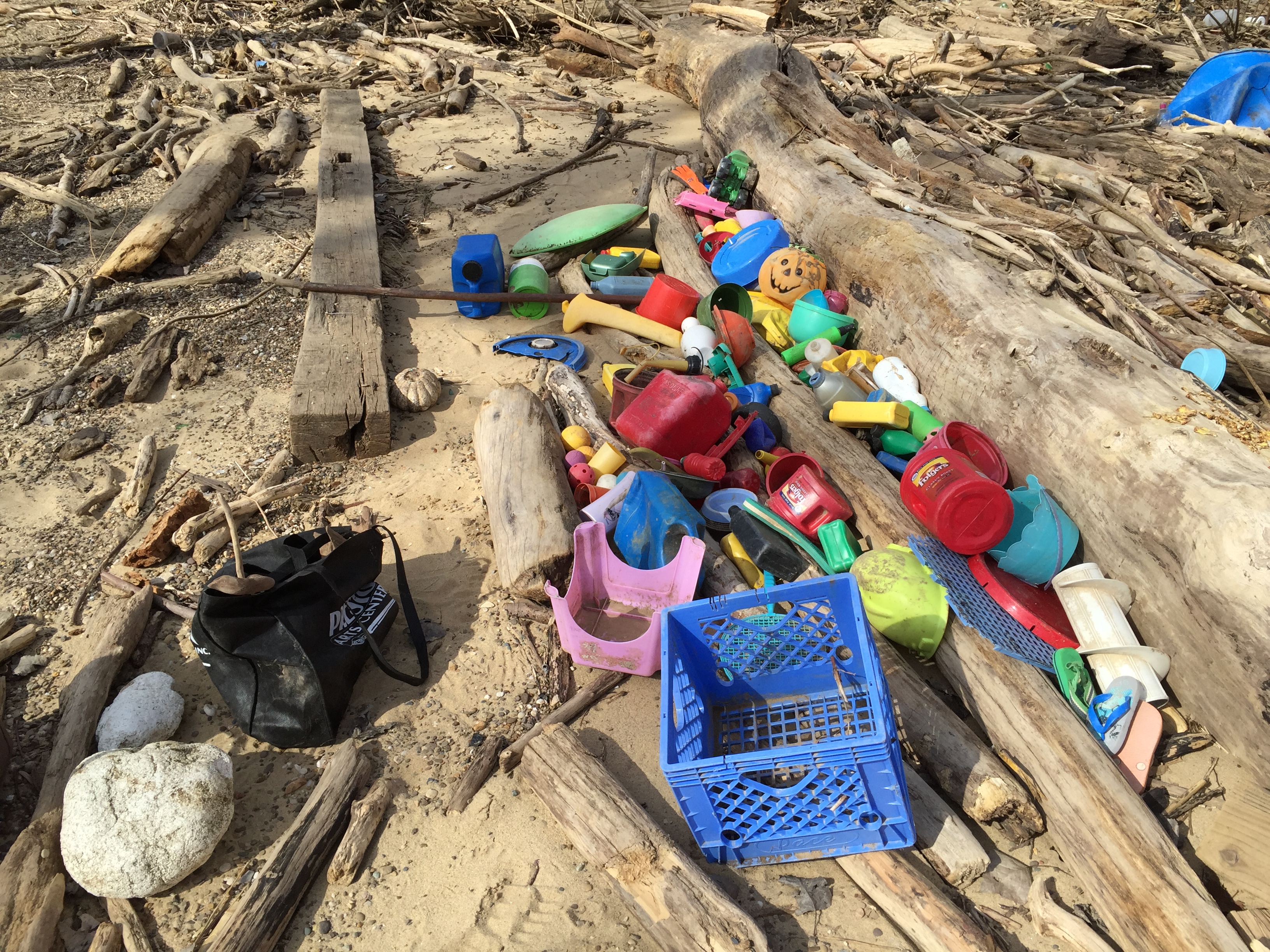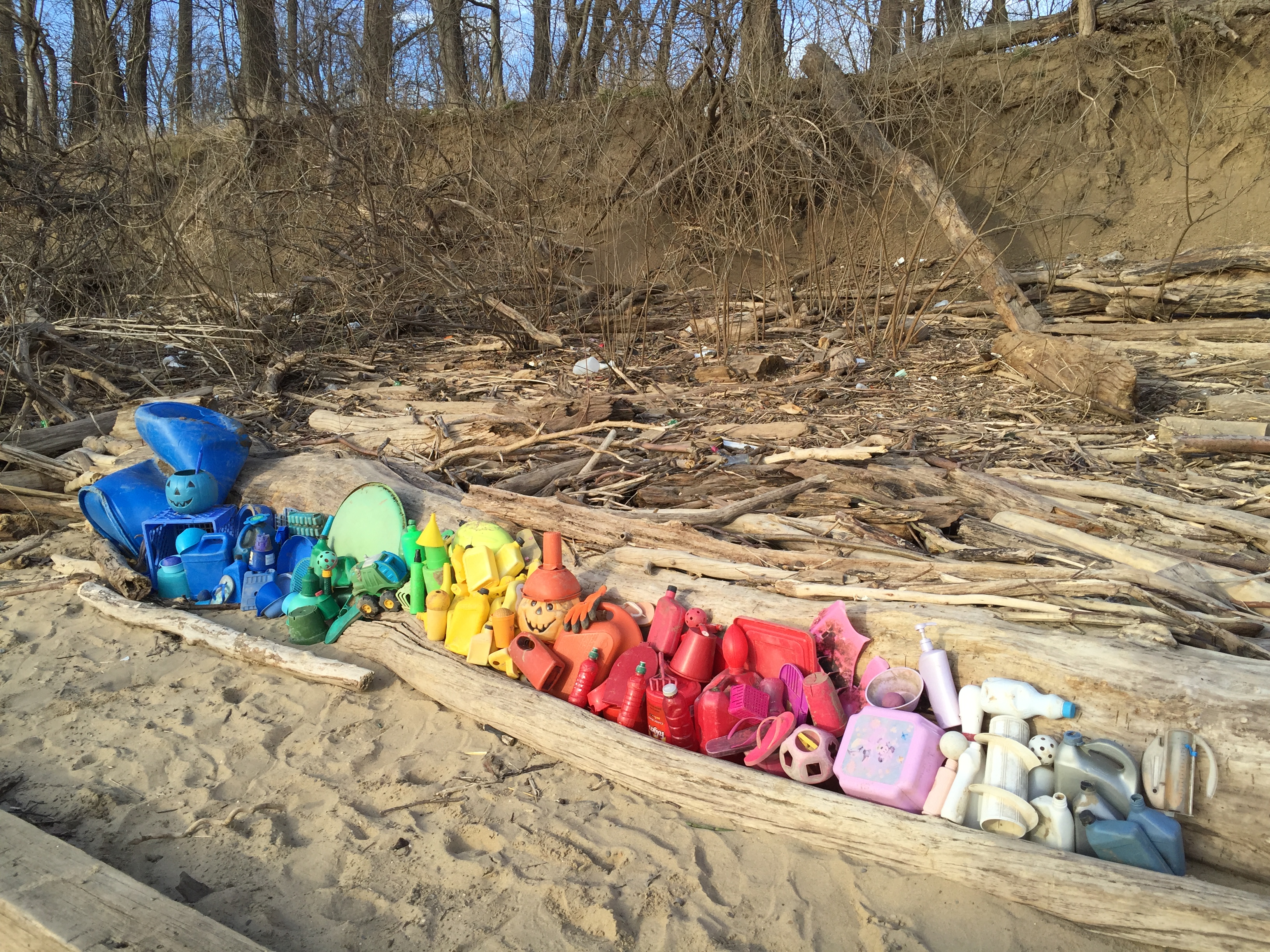 Using the patterns and intervals of driftwood that the river had previously laid down here as a supporting structure where today’s found plastic is sorted by color and staged. Here is where you might find out that you picked up more green bottles than yellow or that purple was that day’s hard to find color.