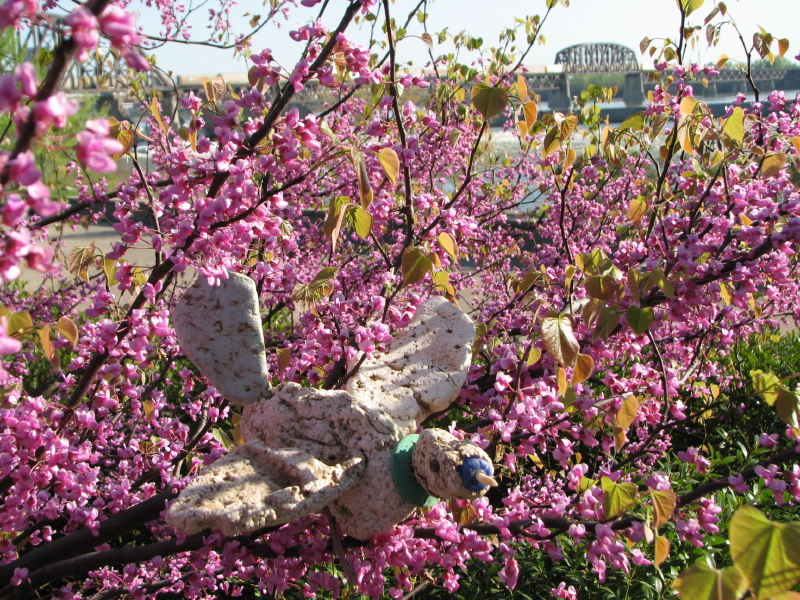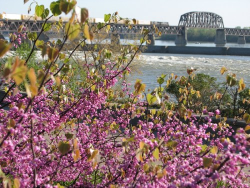 I followed the bird to the front of the Interpretive Center where our bird began to display in a most gloriously blooming Redbud Tree. This bird times its appearance in our area to the blossoming of this tree. What this bird lacks in physical charisma it compensates for by immersing itself in the beauty of this tree within site of the river. After watching it bounce from one blooming limb to another it flew off leaving me with this view.