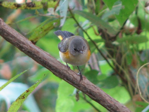 On this day I was doing my birdwatching thing and trying to photograph some of the warbler species that migrate through here in the fall. It’s a real challenge for many reasons. First, there is still enough foliage around that it is hard to get an unobstructed view of a bird. Second, the migrating warblers are now much duller in color having lost their breeding plumage, can be hard to identify. In some cases, the differences can be dramatic between how a species appears in the spring and how they look on their autumnal migration south. Added challenges also include that these birds are very small and extremely active. They don’t sit still for long. On those occasions when I get a picture that I like…I feel more like a fortunate opportunist than as a photographer with any skills. I know I’m rambling, but I need to set the scene first before getting to the point of this post! It took a bit of luck and patience just to obtain the above photo of this first year American Redstart and it looked like this bird was going to hang out a bit and I was well concealed and anticipating more images when something very interesting happened. There was movement in the brush below the bird which flew off and I was left with this quickly snapped photograph!