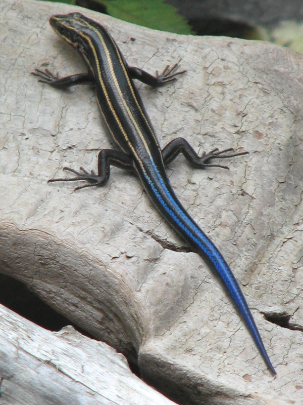 The blue tail marks this as the young of the Five-line Skink. This is a fairly common lizard in this park and the one most people are likely to encounter. While I was hiding behind a sizeable willow tree, I saw the Flat-faced Cat attempt another unsuccessful hunt and took these images.