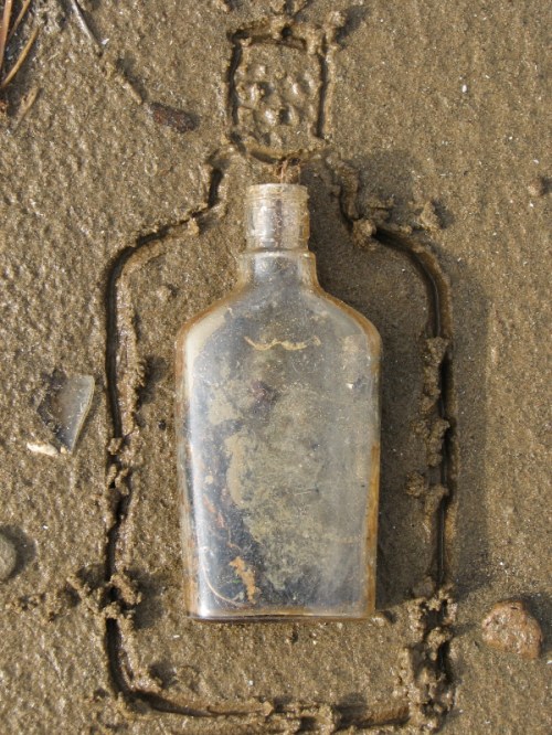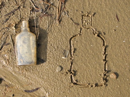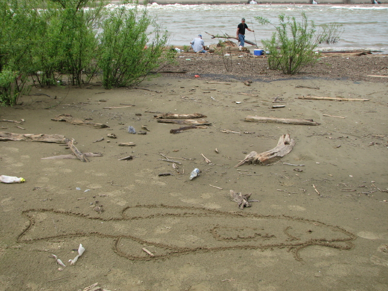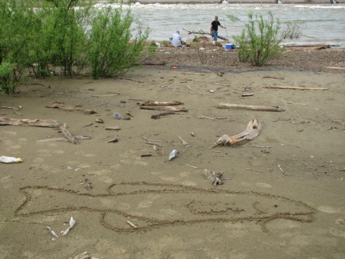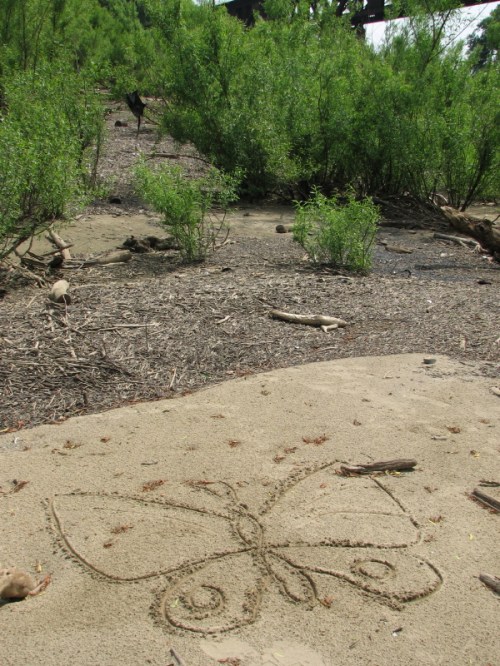 Of course, while I’m walking along I’m filling my collecting bag with the odds and ends that make up the rest of this riverblog. Some of it is just stuff that I will attempt to make art with and the rest are souvenirs of our material culture. Once the bag was full, I turned and headed up the bank to get under some trees and out of the sun. I then made this sand butterfly to mark the spot where I turned for the willows.