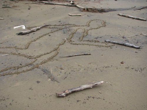 The grackles were working the river just like the fishermen were. I left them a drawing in the sand as well made with the tip of my walking stick. The sand today is moist and firm which holds a fine line better than usual.