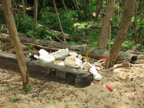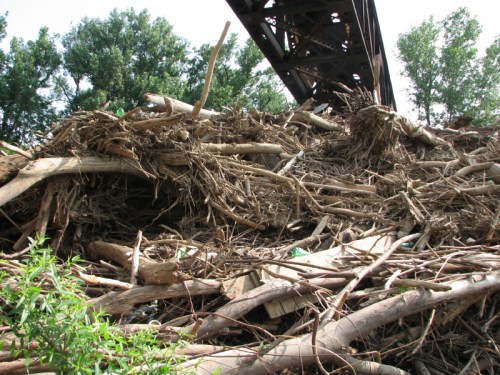 The huge mound of recently deposited driftwood under the railroad bridge is both an obstacle and a magnet. It’s not easy to walk over and it helps to have a good walking stick to help maintain your balance. The rewards for persevering are a nice elevated view of the Louisville skyline and the potential for finding interesting junk intermingled with the wood.