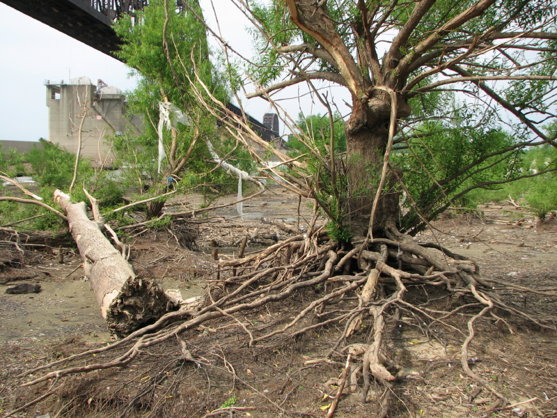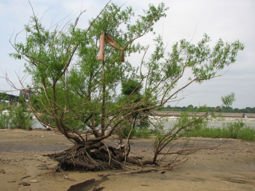 Once you move over or around this mound you enter the margins of the willow forest and you can see what the full force of the river can do to a landscape. These black willows are tenacious and their roots hold on. Here’s another image of a remarkable willow tree and its root mass. This one wears a trophy from the flood like a victory pennant.