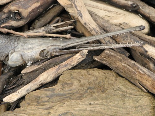 From all the cars in the parking lot, I’m guessing the fishing must be pretty good today. I stepped by some earlier evidence in the form of this longnose gar skull. I think this one was caught by rod and reel. But, I have seen the remains of hundreds of these fish before stranded and killed by a retreating river. Longnose gars are routinely in the 3 to 4 feet range in length. The jaws are lined with small needle-like teeth for catching and holding on to smaller fish. The gar is a surface fish and floats in on its quarry like a piece of driftwood very stealthily before surprising it with a quick flash of the jaws.