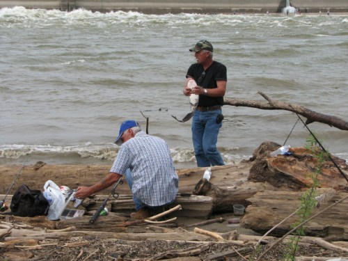Moving to the river, I decided to watch what the fishermen were doing and catching. In about twenty minutes, I watched two large catfish being landed. Here are two guys that have this down. Using multiple poles, they cast both worms and cut shad into the swiftly moving waters. Snags and lost tackle are common since this part of the river is also full of rocks and boulders.