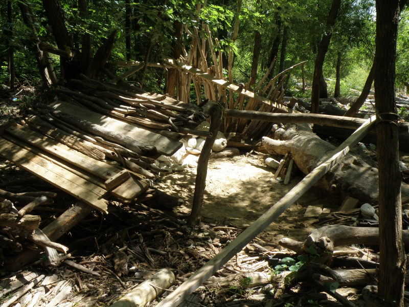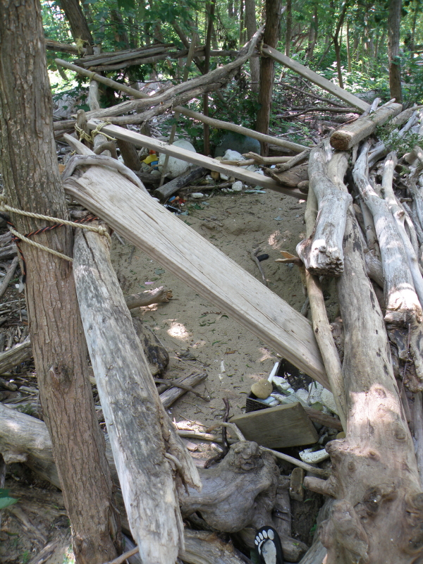 The structure the visitors are building is enclosing the space. As it is, it’s difficult now to stand on the center sand, especially since a growing pit is developing. My collected river materials continue to be strewn about. I initially liked that someone else was seeing the potential of this site and adding their distinctiveness to the mix. Now I’m seeing less intent here and and I’m going to make the next move and see what happens? First, I will need to find and repair the large Styro-figure I left here sitting on the roof. He’s a participant/witness to all the proceeding events.