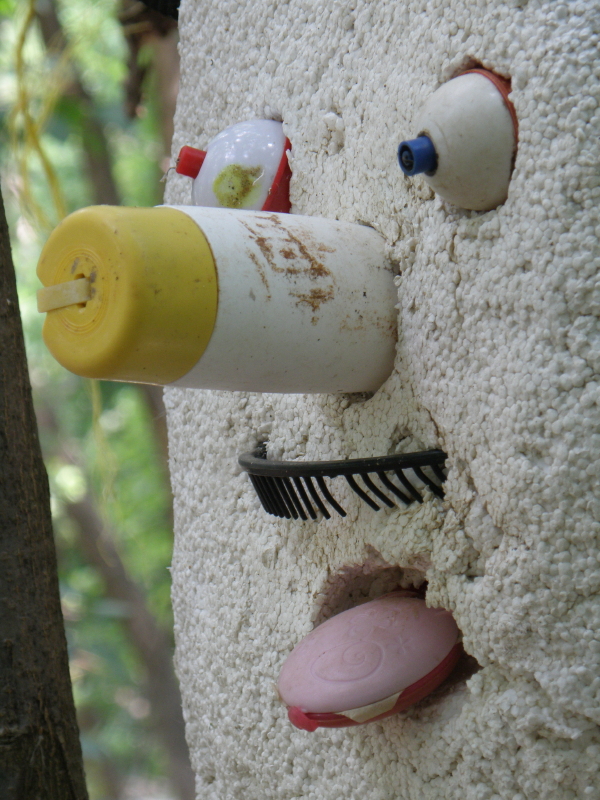 Again he looks like he was cast aside. I find everything except his mouth and replace it with some other river plastic I picked up. I reattach his arms and legs and he’s as good as new again. Well almost, the excitement with the visitors and the unpredictable nature of the river have dinged his persona. He never said much before and he says even less now. How unfortunate. I park him in a nearby try to keep him safe.