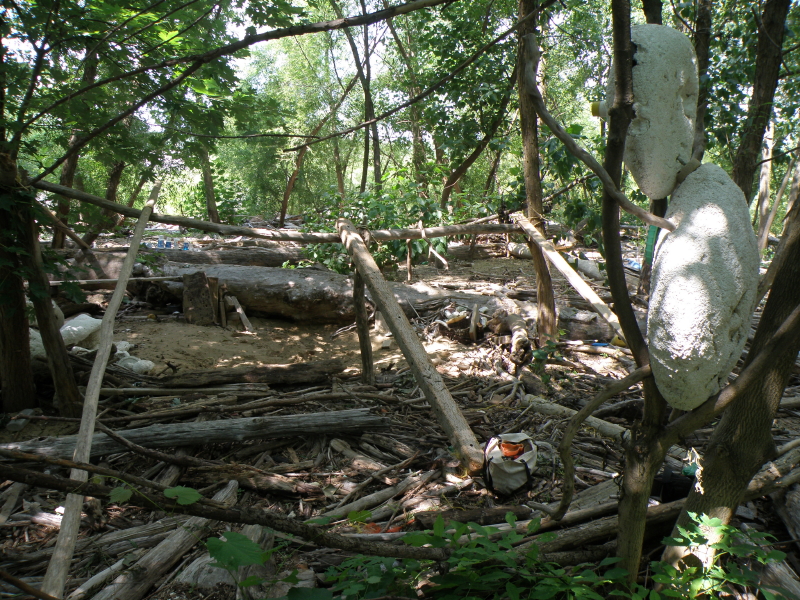 When last we visited the Falls of the Ohio the river was rising. Several days of intense rainfall throughout the Ohio Valley are now flowing by and coloring the water a muddy ocher. My outdoor site where I make my polystyrene figures and store materials is being usurped by twin forces. It’s difficult gauging the intentions of this visitor or visitors, however, I also continue finding their waste soft drink cups and bottles. What’s with the blue drinks? I guess the color blue is also your symbol for cool refreshment. If I am to continuing working here, I will need to change the driftwood structure erected over my site. I was secretly hoping that the river would solve this dilemma for me. If the water rose high enough, it would move the largest beached logs which would effect everything near them. That didn’t happen. The river fell short of my spot and a visible line demarcating brown wet wood from bleached, silver-gray wood marks the high waterline.