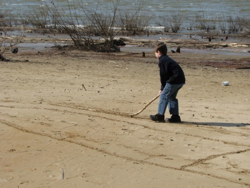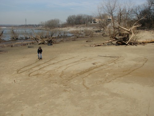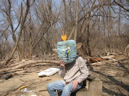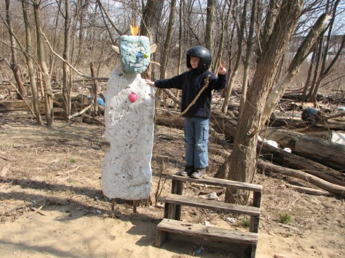 Adam wanted to go exploring around my area and while he did that I made this quick figure. Two pieces of found polystyrene, coal eyes, plastic pen cap nose, wooden ears, plastic mouth, a plastic neck collar, and five sharpened sticks along with a foam letter “A” comprise the materials used to make this guy. By the time Adam got back from circling around the site it was time to go…but first we could make a few photos along the way.