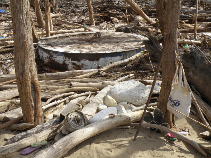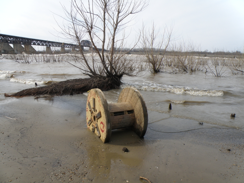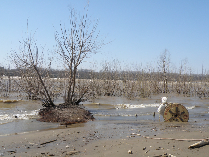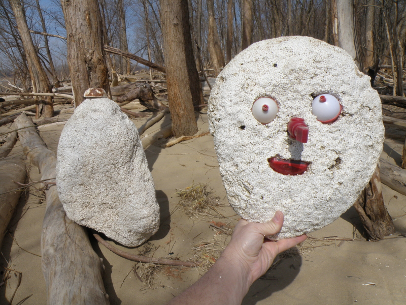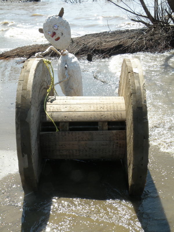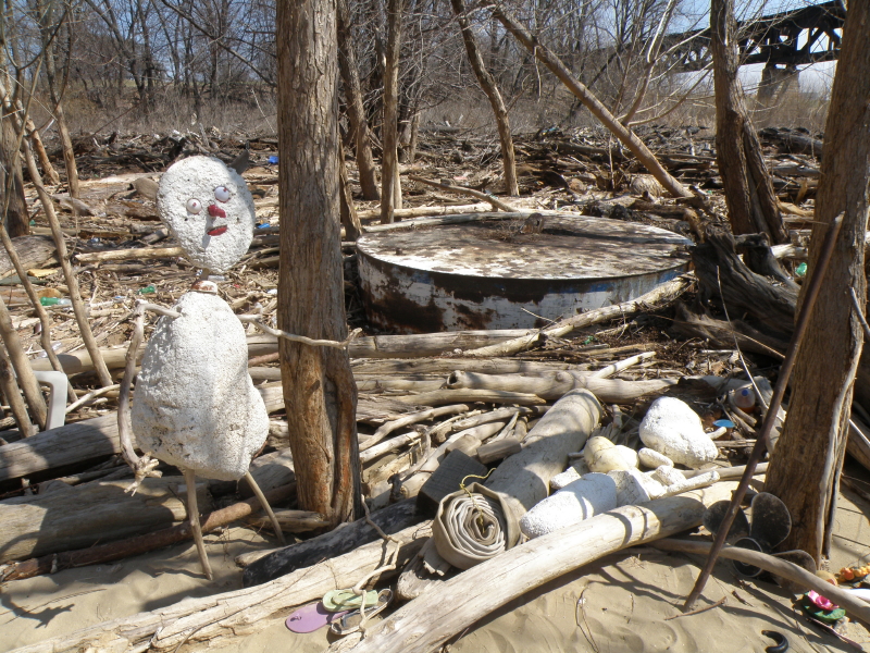 Near tiny willow island is a large wooden “spool” for wire line or cable. I’m amazed by this object’s heavy-duty construction. This spool floated into here and is now partially sunk into the sand. Small waves lap the shoreline and you can also see black coal dust swirling around the water’s edge. Later when I see my pictures I’m struck by how similar this spool is to the circular platform that now forms part of my latest outdoor studio. This new area to cache my materials is very visible and hence ultra public, however, if we have heavy spring rains…it’s very possible that all this will be washed away and rearranged again. I often wonder what might go through people’s minds when they stumble upon my outdoor atelier? It’s an odd archeological site of Styrofoam boulders, small piles of plastic toys, and a tangle of found roots and driftwood. All the stuff you need to make an absurd figure! I left my latest Styro-creation next to the spool. I will go a head and tell you…I returned a week later and all I could find of him was his body and legs. There must be headhunters out here? I searched the area, but found no further trace of my figure. As with most of my Falls projects, they continue to “exist” as images. The exhibition that Michael Wimmer and I are participating in at the Carnegie Center of Art and History is entering its last week. I’m so appreciative of the positive response I’ve received for my work. The show will end with a tea and cookies closing. If you are in the area, please stop by.