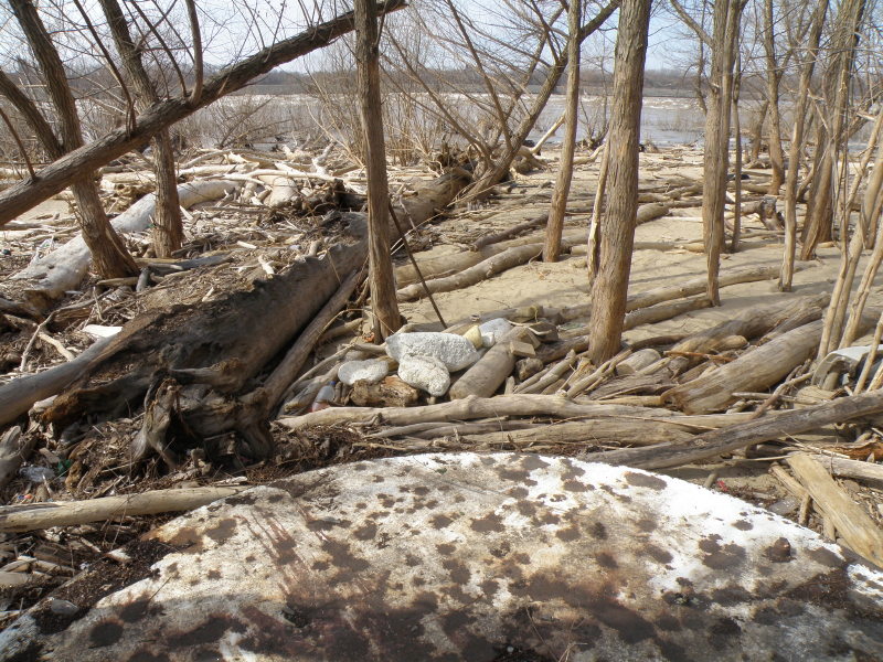 It’s a sunny Saturday and warm for this time of year. One of those days I can’t wait to get to the river. Spring is still slow in developing, but it can’t be much longer now. I spent a good part of the day just filling up my canvas collecting bag with all types of odds and ends both man-made and natural that have washed up on these fabled shores. I’m finding so much stuff that for practical reasons I decide to see if I can find a spot up the bank and under the willows that might make a good location for a temporary outdoor art studio. I can offload some of my larder for future use while continuing to walk the edge of the river. I’m enjoying the sunshine and taking deep breaths of the fresh air.