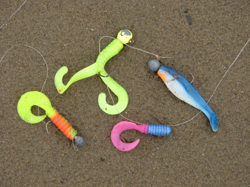 Although I have made many fishing figures over the years, this one was inspired by that day’s finds. Walking the riverbank, I assembled a small collection of soft-bodied jigs lost by real fisherman. The river works them loose from wherever they are snagged and beaches them lead-head and all. The curving tails are intended to flutter through the water once they are reeled in. It’s an effective movement that fish find hard to resist.