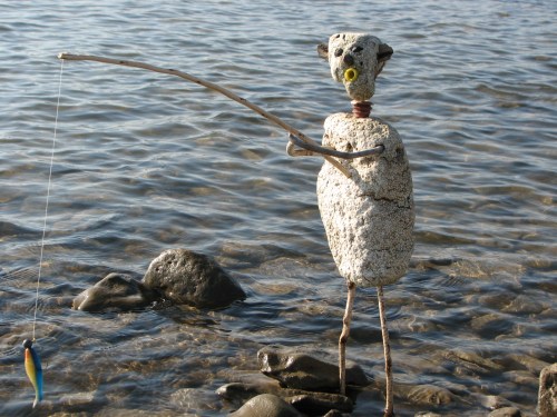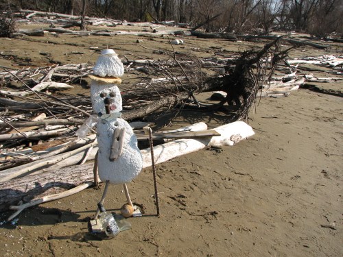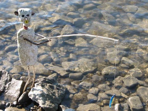 When I come out here, I try to make something from the debris I come across. I usually always feel better about life in general when I’m engaged in creating an artwork. Here’s the fisherman figure I made on this day. He is standing on beaver-chewed willow legs as is the pole he holds.