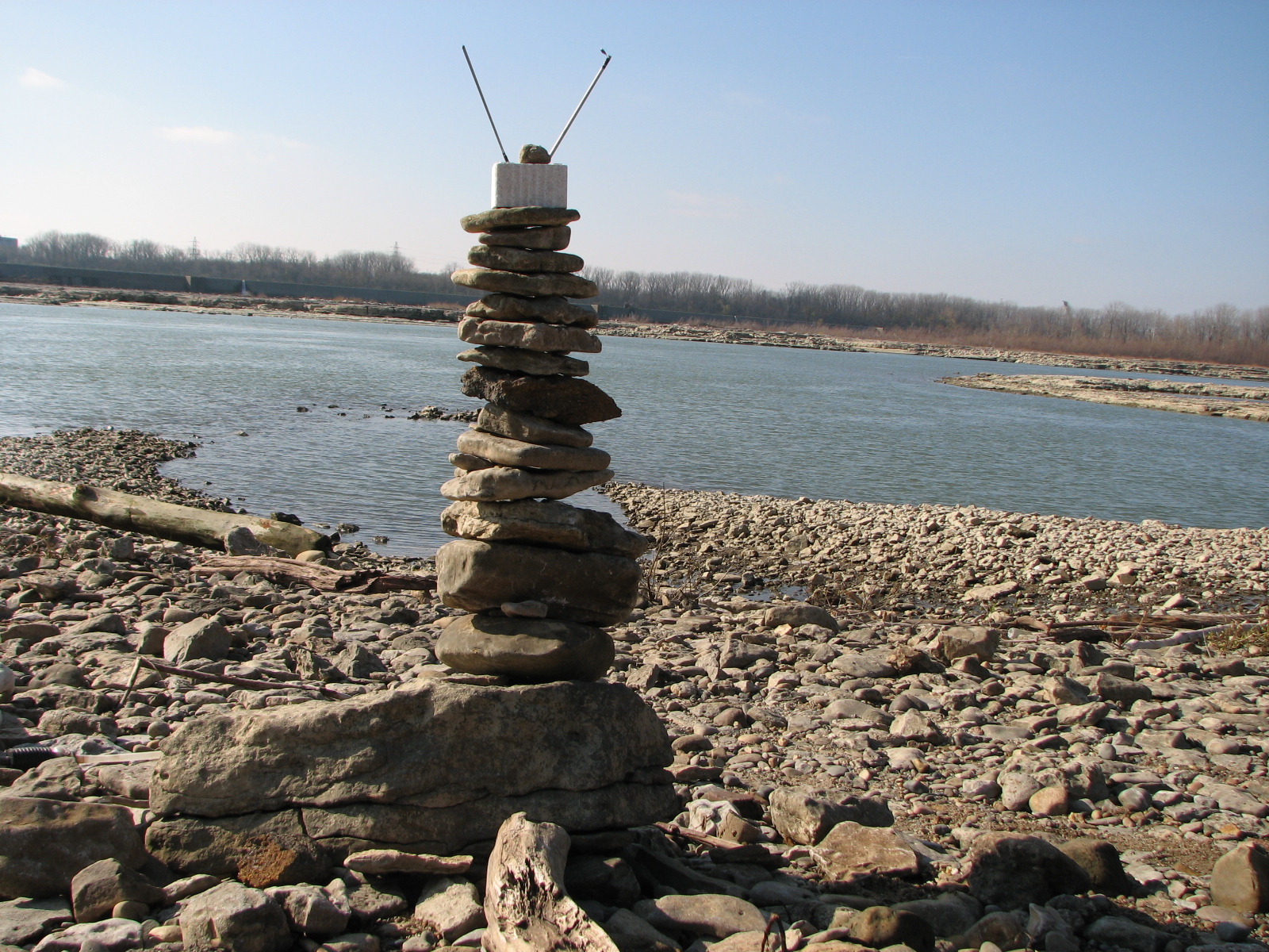 Visitors have “recycled” one of my old pieces and made this work that I call “Jack Daniels” based on the empty whiskey bottle stuck in the sand by its feet! It’s a decidedly tipsy work and seems to sport what I think may be an improvised ice pack on its head. The turned-wood cane steadies the piece and provides much-needed support. Perhaps the same person or persons did this other sculpture near “Jack”? It may be either a robot constructed from stacked rocks or maybe an image of a small television with antennae balanced on stacked rocks? It doesn’t really matter. I responded to the sight and added it to my collection of images of “Other People’s Art Made at the Falls”. Over the years, I have also collected pictures of what other folks have made and left with materials indigenous to this area. Actually, I’m surprised that I don’t come across more of the stacked rock works since that seems like such a universal human thing to do.