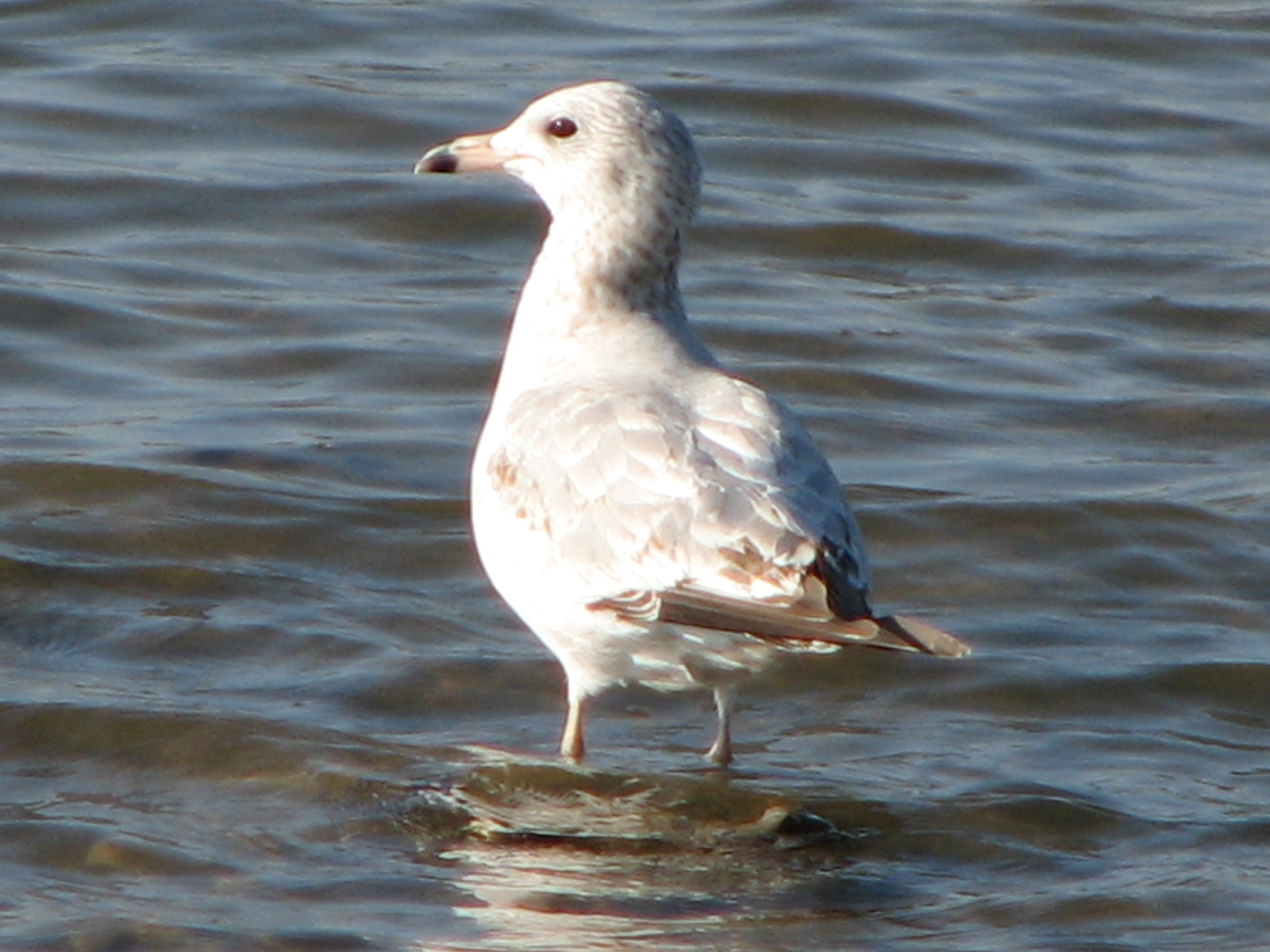 Appearing with more regularity are the Ring-billed Gulls that move into our area once the weather begins to cool. I observed a large flock with their distinctive white dot on black wing tips flying above me in a slowly circling ball. Maybe they were getting their bearings on their way to other areas? Anyway, a few stray birds peeled away from the drifting flock and remained in the immediate area. I photographed this juvenile Ring-billed Gull standing in shallow water near a small Styro-fisherman I had constructed.