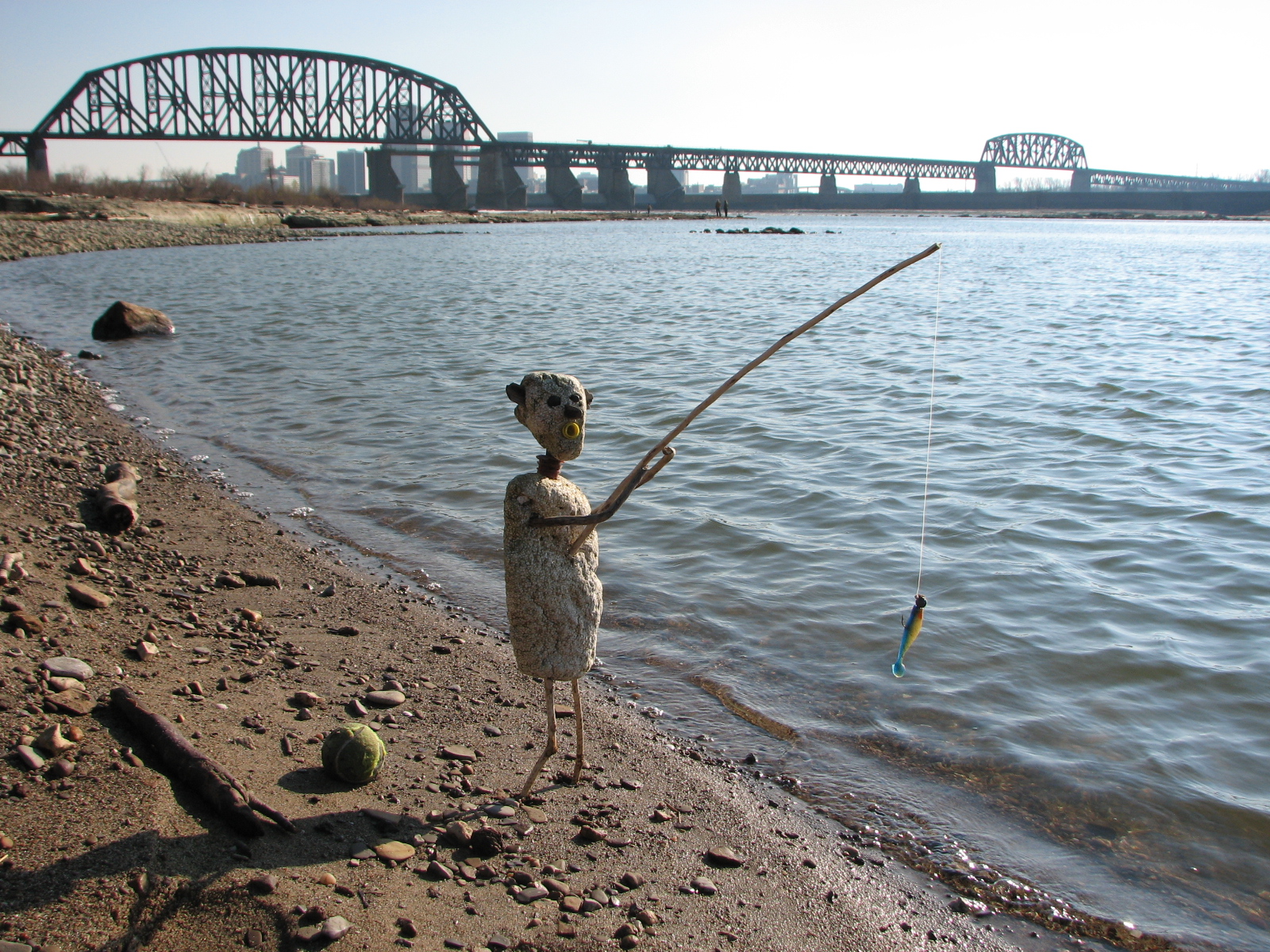 The river is low and clear and fisherman have been testing their luck at the Falls of the Ohio. It’s one of those situations where even if the fish aren’t biting, it’s still wonderful to be out in nature. Sightseers have been moving along the riverbank and on this occasion I have come across other sculptures that while they aren’t mine…may have been inspired by what I do out here?
