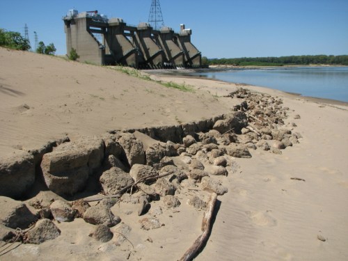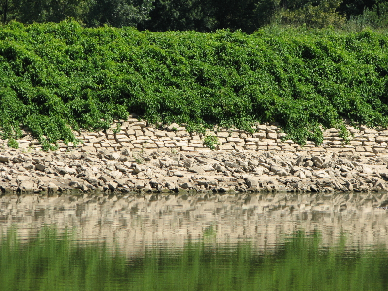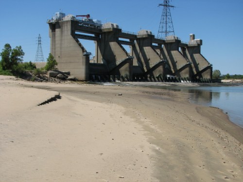 Continuing my walk on Goose Island, I can see the wall of the Fixed Wier Dam and the hydroelectric plant in the distance which is situated on Shippingport Island. The plants in the foreground with their prickly, ripening seed pods are Jimsonweed. Along the sandy bank, I could see slides where beaver have dragged their tree cuttings from the nearby woods into the water. There is probably evidence of a dam nearby, but I did not see it on this trip.