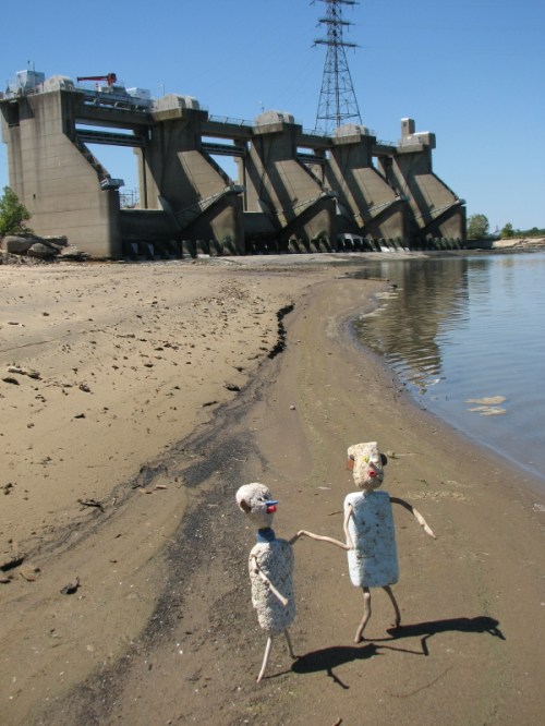 This is as far as you can walk in this part of the park. Goose Island’s western edge ends at the Upper Tainter Gates. This is a popular area for fishermen who reach this spot by boat. I did see several Osprey circling the sky here. There is a small section of sand dunes on Goose Island that are shaped by wind and wave. In the above image, bird tracks crisscross the sand. I placed my final coal figure of the day here at the edge of a dune. This time the figure has been turned on its side. Plumes of sand were blowing up and away at the dune’s edge by wind. In the image below, the distance from the top of the dune to the riverbank on the right is deceiving. I estimate that this is a seven or eight foot drop and a short roll to the river.