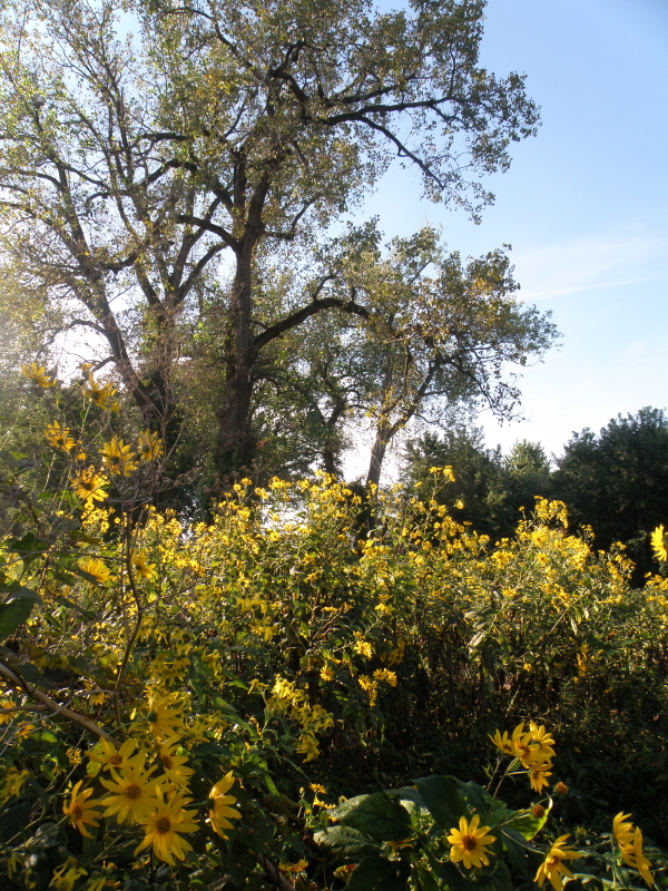 This post is the last of this year’s summer posts and documents a walk I made at the Falls of the Ohio State Park one week before autumn officially began. As you can see by the pictures…it was a very beautiful day filled with all kinds of discoveries. There was a profusion of yellow-flowering plants of various species including goldenrod and sunflowers. Here is a detail, I think from the Woodland Sunflower? I wish I was as confident about plants as I am in identifying animals. When I break out my flower books, I realize it would aid identification greatly to have an example on hand. Collecting plants is not allowed within the park limits…so I try to take photos that might be of use in discerning the various closely related species. Besides, I don’t think pressing these plants flat would even work? I ask myself, what leaf shape does it have? Are the leaves serrated, smooth, or hairy and how many rays do the flower heads have and other such questions of concern to the botanist.