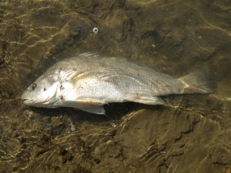 This is a Silvergill which is closely related to the Iron Gill (which I have posted about previously). Differences between the two species include size (this fish is smaller) and some of the fins are not the same shape or in the same position. The Silvergill is much more rarely encountered than its larger cousin. It is found in water of average to poor quality and often associated with coal and coal dust. It is omnivorous and eats aquatic insect larvae and algae which it grazes off of rocks. I’m assuming that it washed up here a victim (like the Freshwater Drum) of an angler looking to catch something more worthwhile. I took a few photos and then moved on. The fossil beds were beckoning and I could see the resident flock of Black Vultures congregating on the rocks. No doubt they had discovered a fish or two on their own. Until next time from the Falls of the Ohio.